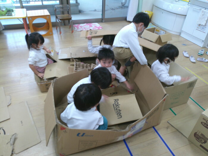 みんなが楽しみにしているお散歩へ! 公園につくと「どんぐり落ちてる~!」とうれしそうな声が聞こえてきます👂 「帽子かぶってる!」「枝についてる!」と新たな発見と共に秋の自然に触れました🍂 遊具でもたくさん遊んで全身運動🔥園庭にはないブランコやターザンロープに大興奮でした! もも組さん 最近お気に入りの遊びは段ボールでおうち作り🌟大きく繋げて何人はいれるかな・・・? | ||