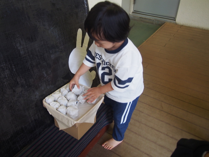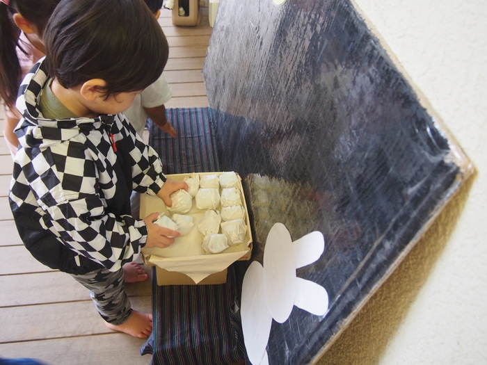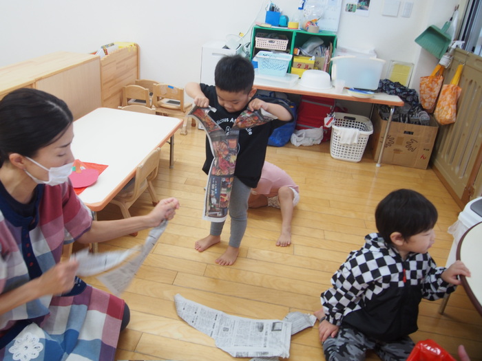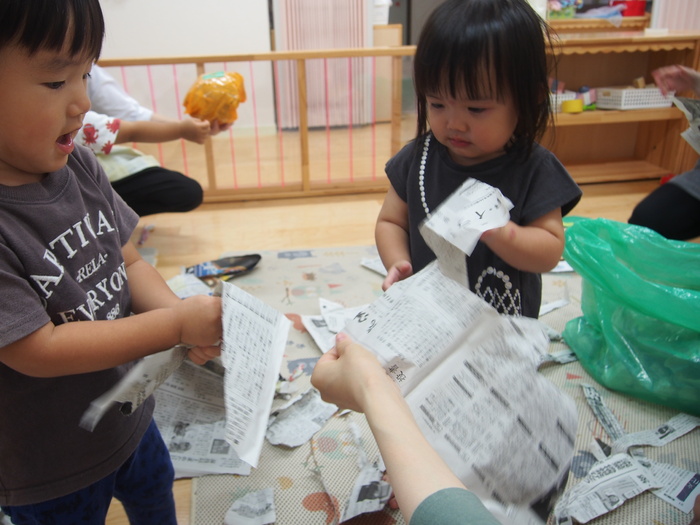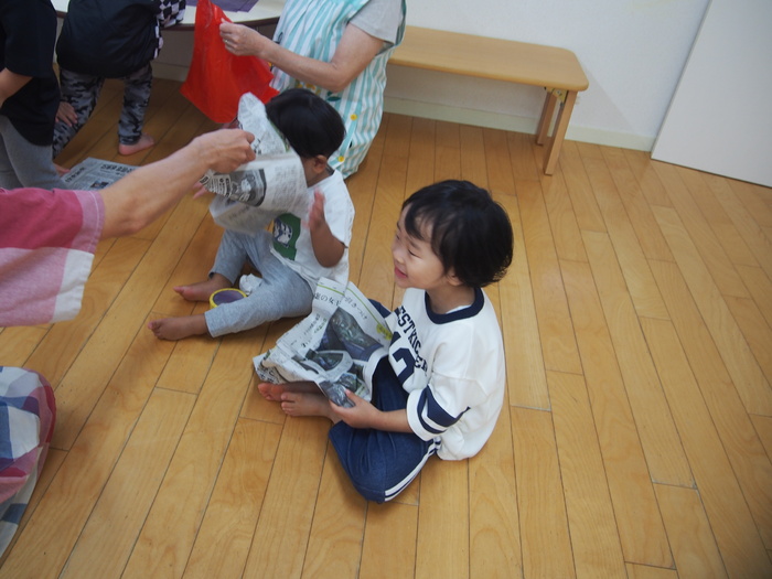 大好きな新聞紙遊びをしながら、お供え物も作りました! | ||