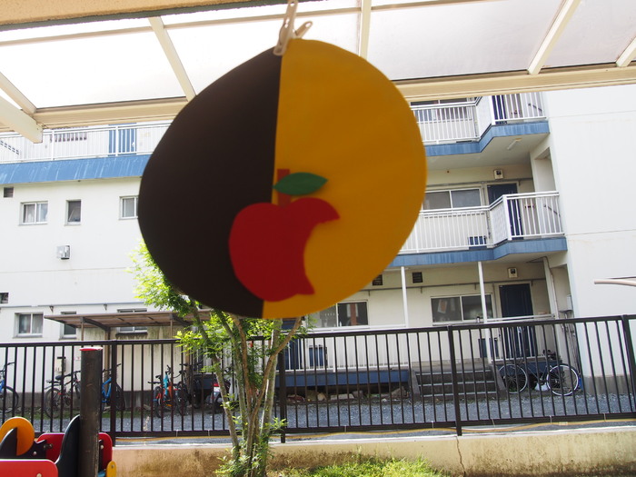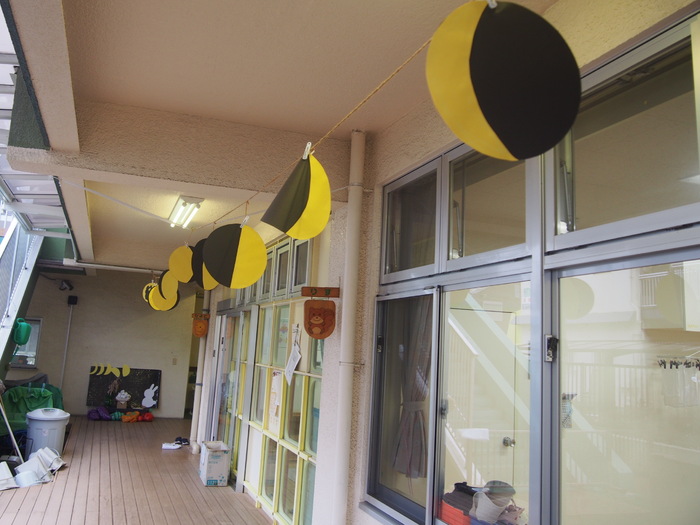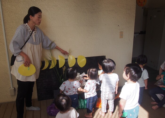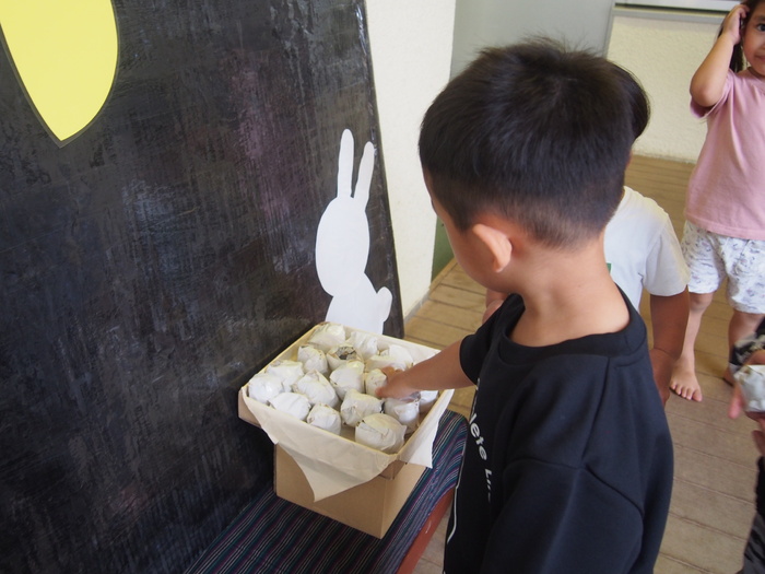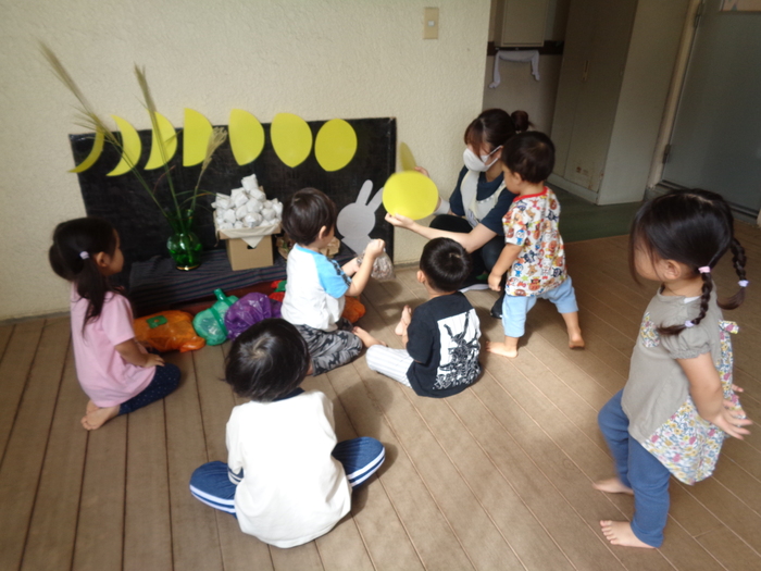 お供えしながら「お月さま、いっぱい食べて大きくなってね!」とつぶやくK君。お月さまがどんどん大きくなることが、イメージ出来ているようです。そんな中「今日はお月様、何を食べて大きくなったかな?」と、お供え物を食べて大きくなったお月様を、吊るしてあるお月見ボードの中から探す遊びも生まれましたよ!子どもの感性は素晴らしいですね!! | ||