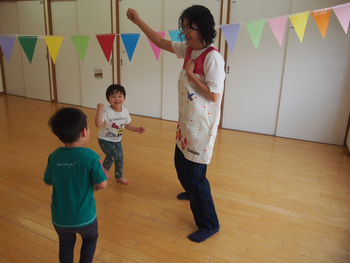 10月3日、広~いホールで運動会ごっこが行われました。ダンスやかけっこ、玉入れなどをおこないました!!みんな自由に、のびのび体を動かしながら楽しんでいました☆ まずは、準備体操のダンス!! 「できるかな」と「エビカニクス」の音楽に合わせ、可愛くリズムをとる、つぼみキッズです♡ | ||