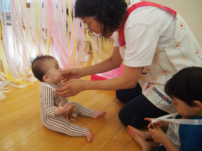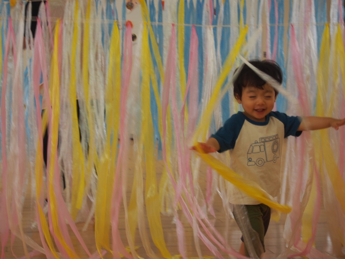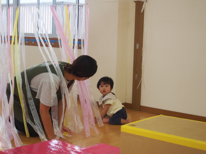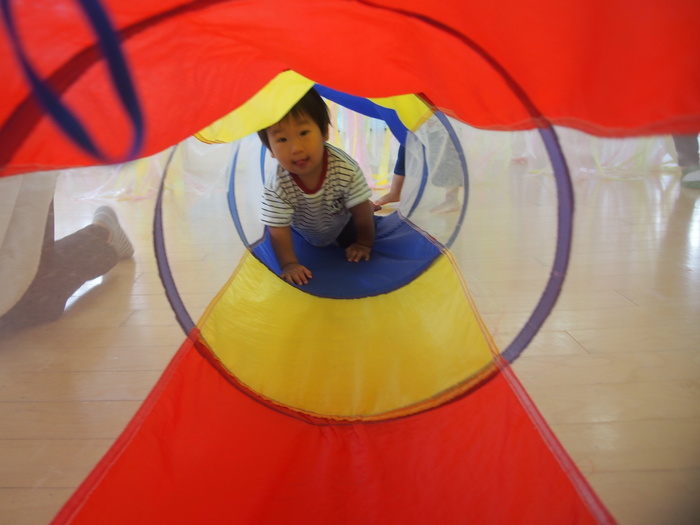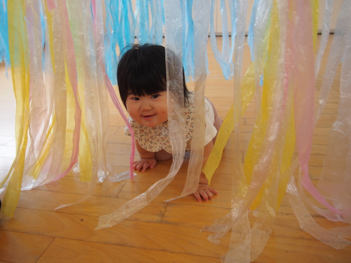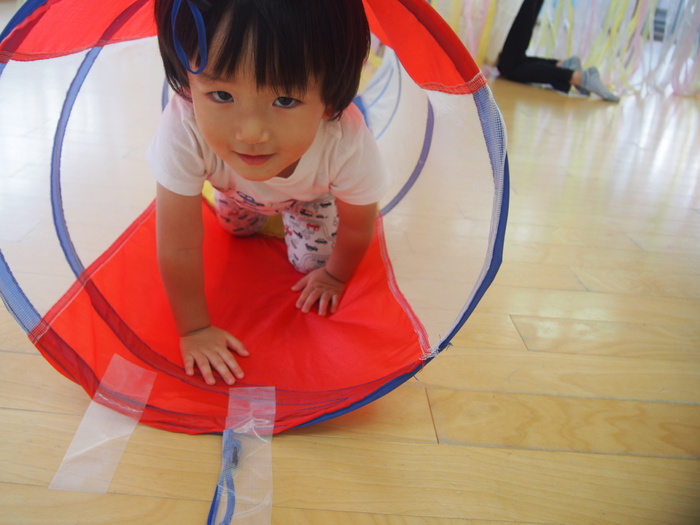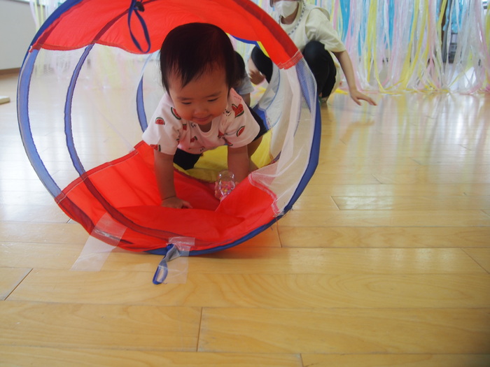 次はハイハイ競争!!スズランカーテンやトンネルをハイハイで潜り抜けました!! | ||