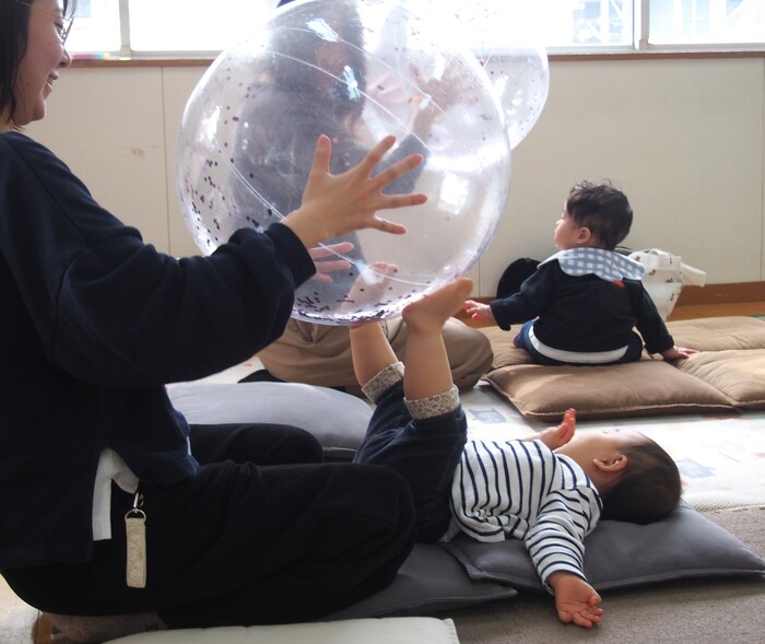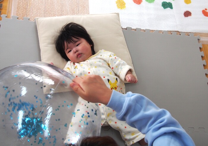 ボールを目で追っているかな? 手や足でつかもうとするかな? 斜めになったけど自分で真ん中に戻ろうとするかな?などなど ボール1つでも様々な動きがありますね | ||