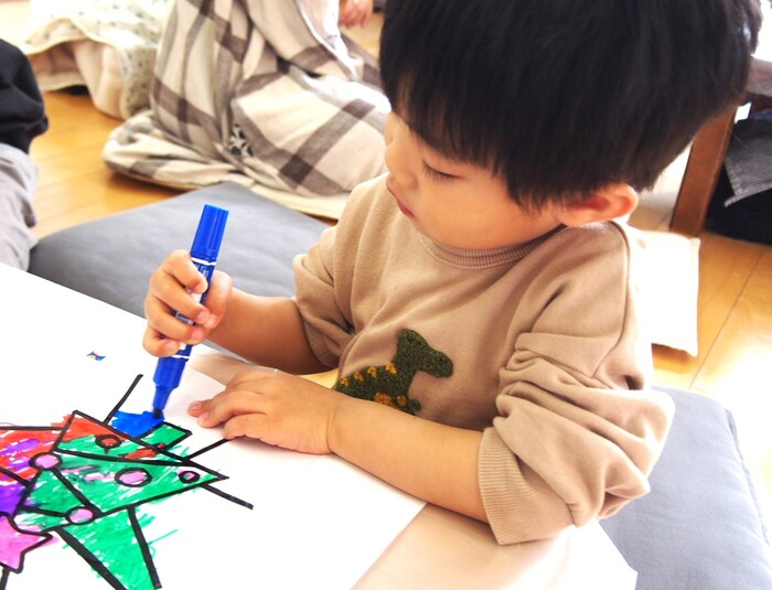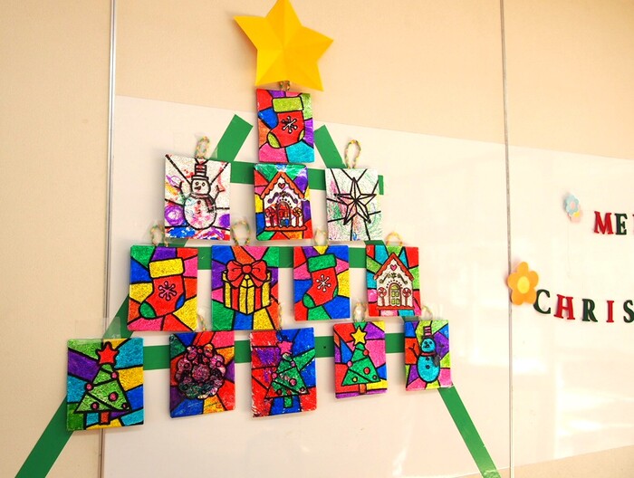 ステンドグラス風のクリスマス飾りを作ります 9柄の中から好きな絵柄を選んで油性ペンで塗り絵をしました 透明のセロファンに黒油性ペンでクリスマスにちなんだイラストが描いてあります 裏返してカラーの油性ペンで色を塗ります (ご家庭で作る時は、水性顔料マーカーだと色が落ちるので油性ペンがベストですよ) | ||