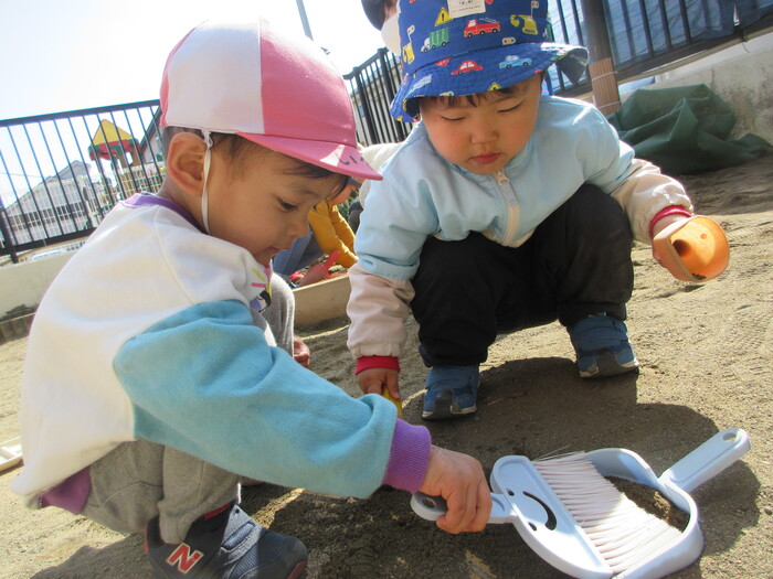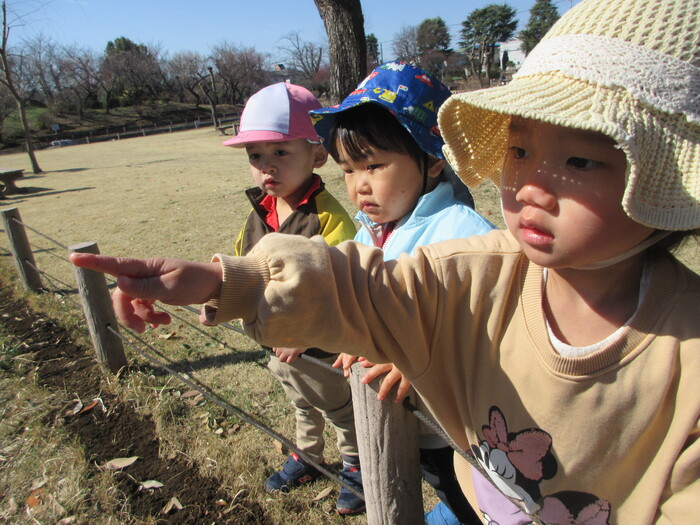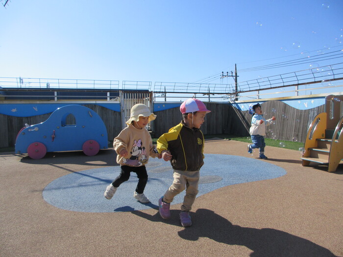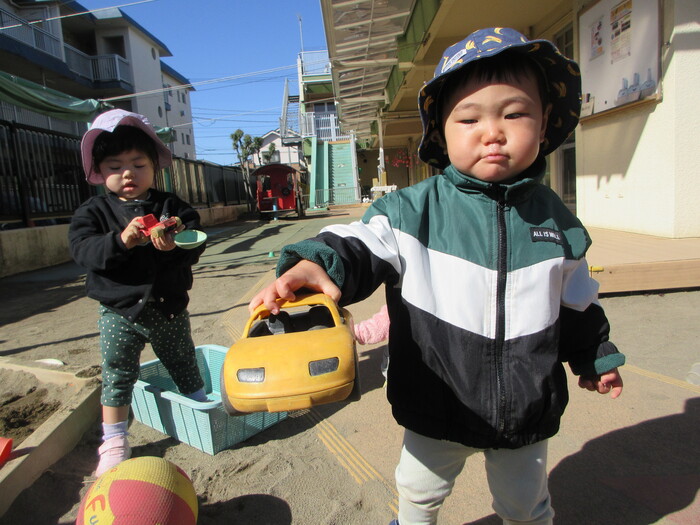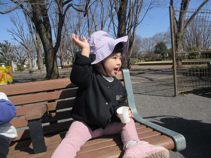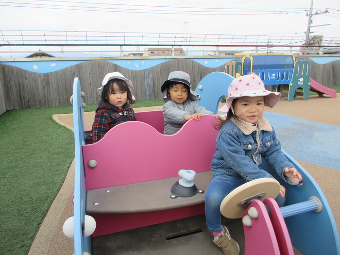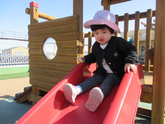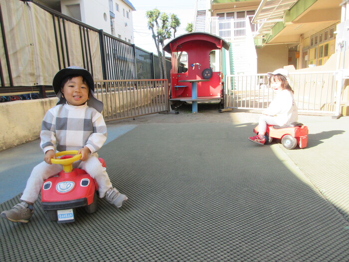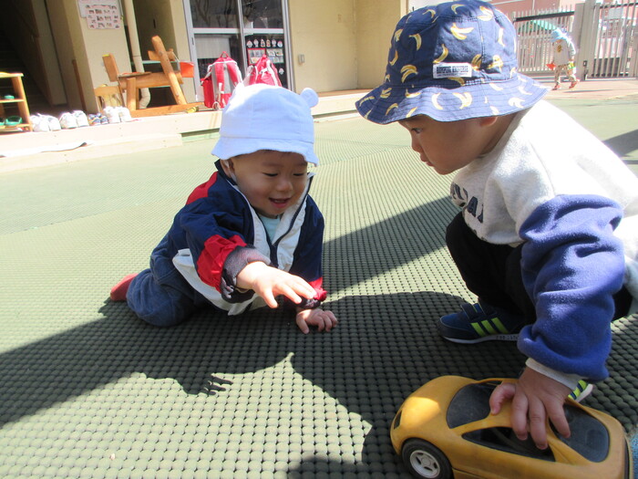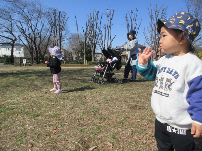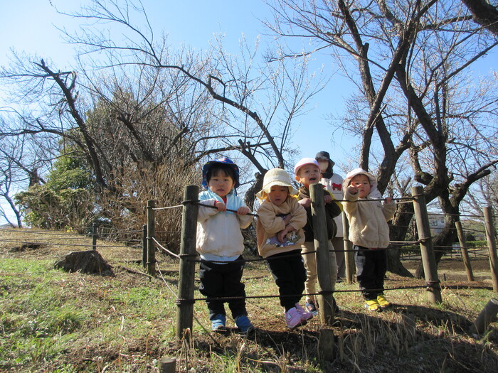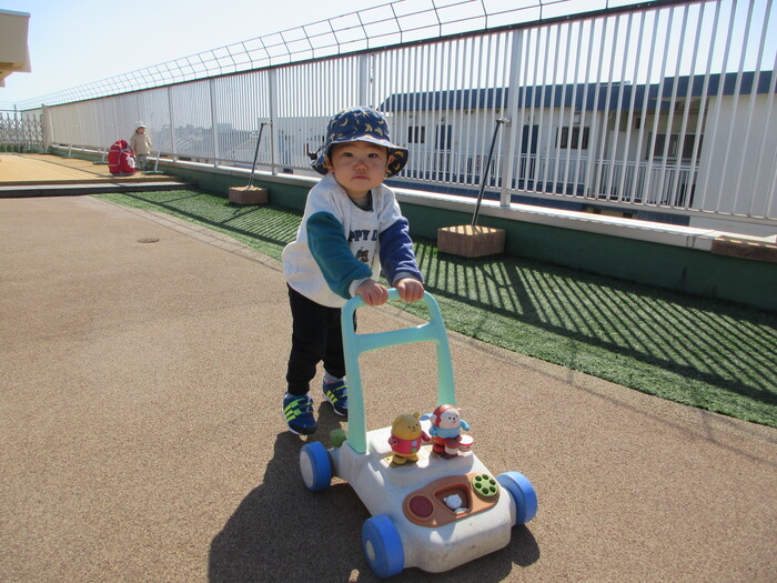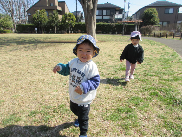 2月から新しいお子さんをお迎えし、なかよしルームの生活が始まりました 初めての保育園に不安を感じ泣いているお子さんもいましたが、気になる玩具や好きな遊びを通して少しずつ慣れてきました。 2月は一年で一番寒い時期ですが、寒さに負けず、園庭や屋上で沢山体を動かして遊びました。 3月になると暖かい日が増え、菖蒲園やぶどう公園などにお散歩に出かけ、沿道のプランターのお花や、公園の木々の花を見て春を感じながら遊ぶことができました。 お散歩に行かれない日も、園庭や屋上で元気に遊びました。 | ||