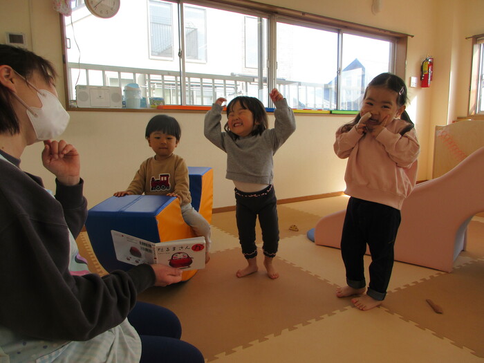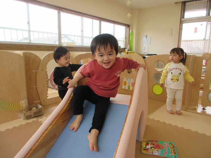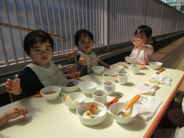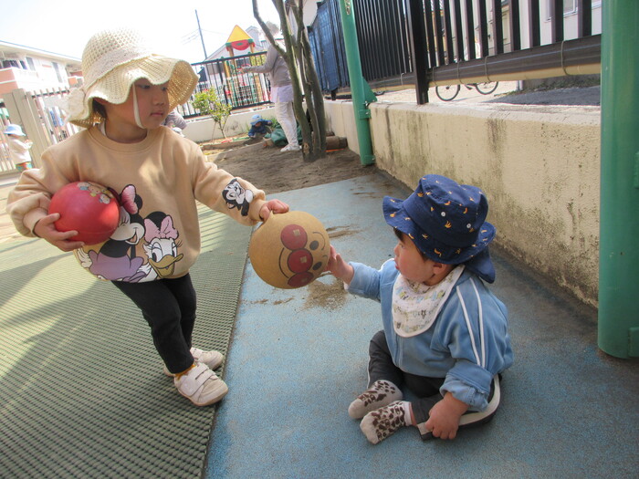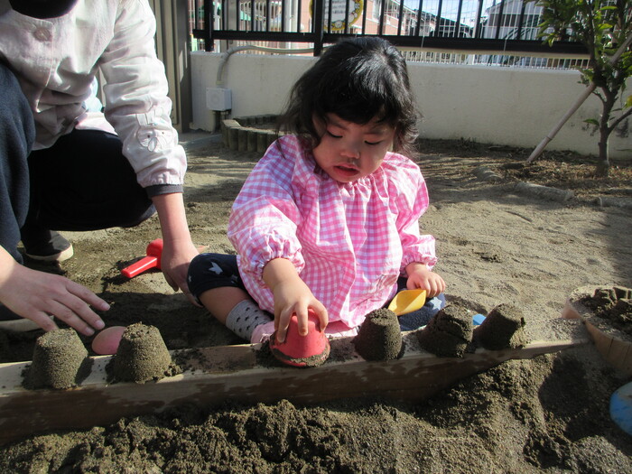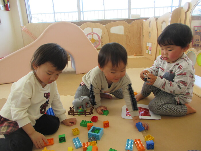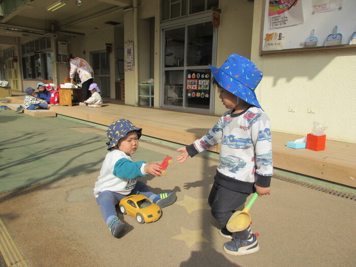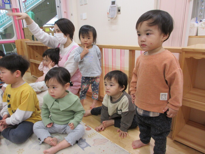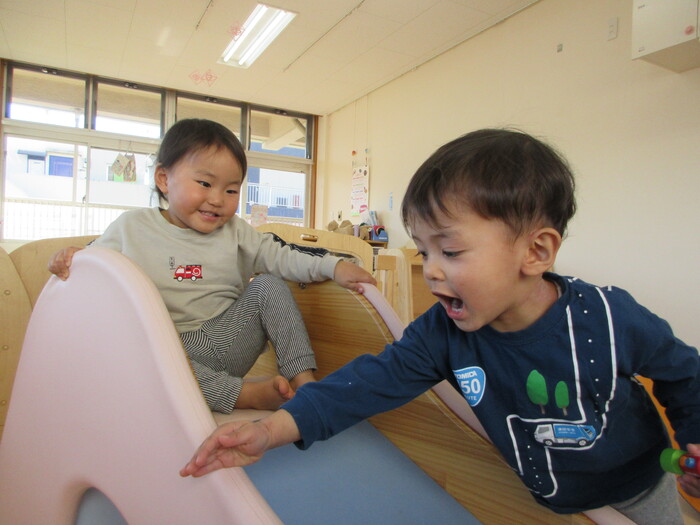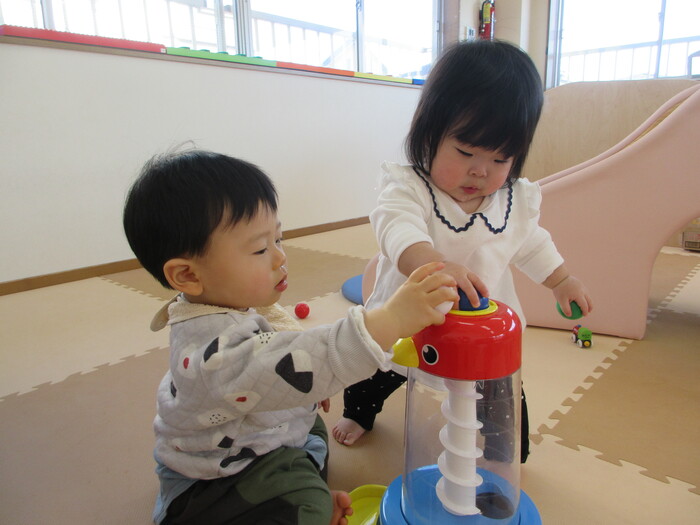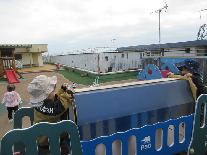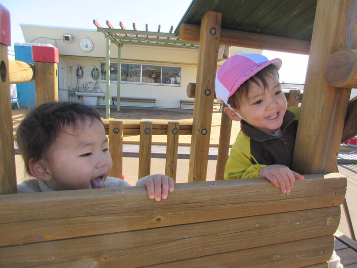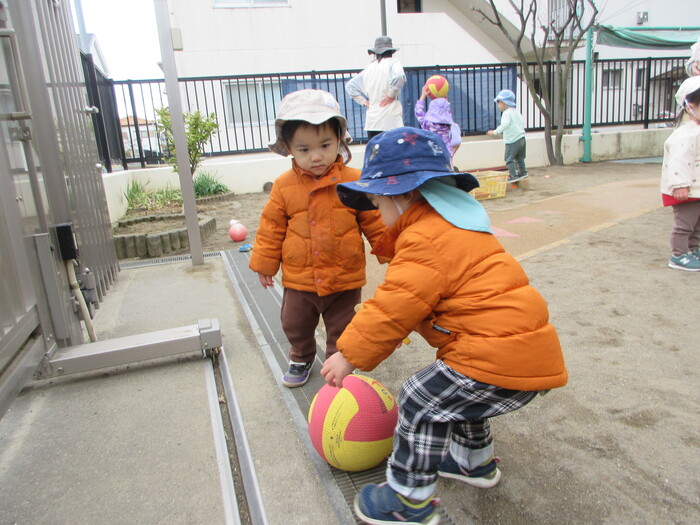 2月から新しいお子さんをお迎えし、なかよしルームの生活が始まりました 初めての保育園に不安を感じ泣いているお子さんもいましたが、気になる玩具や好きな遊びを通して少しずつ慣れてきました。 2月は一年で一番寒い時期ですが、寒さに負けず、園庭や屋上で沢山体を動かして遊びました。 3月になると暖かい日が増え、菖蒲園やぶどう公園などにお散歩に出かけ、沿道のプランターのお花や、公園の木々の花を見て春を感じながら遊ぶことができました。 お散歩に行かれない日も、園庭や屋上で元気に遊びました。 | ||