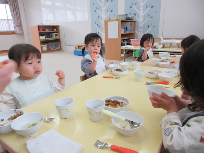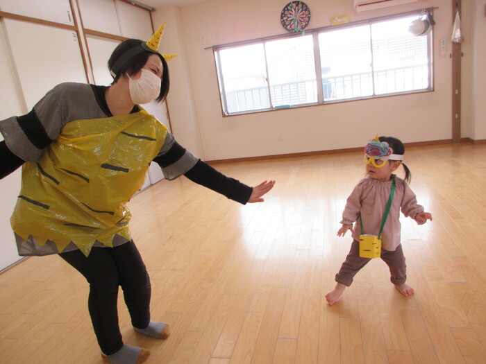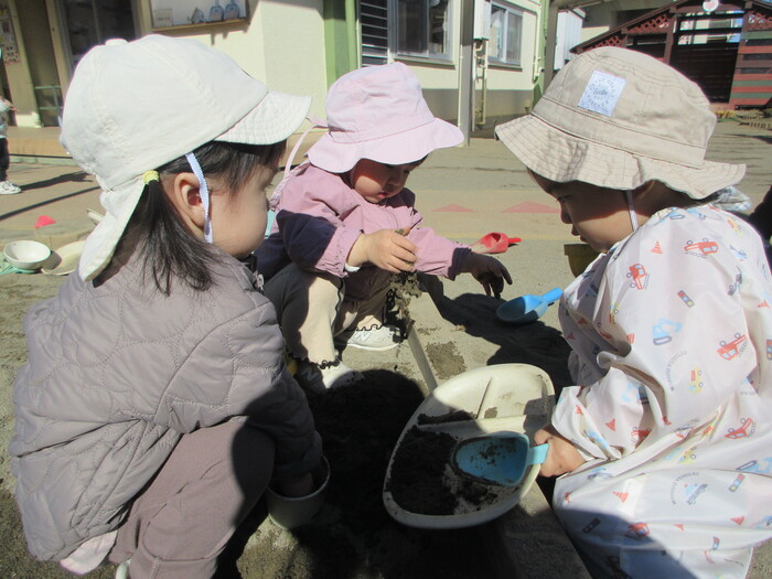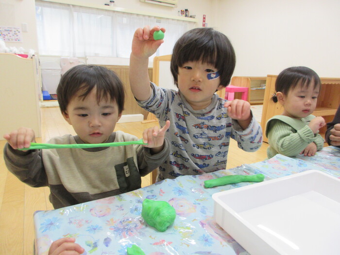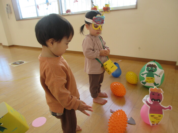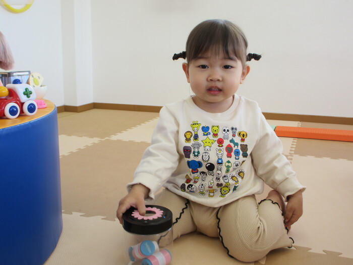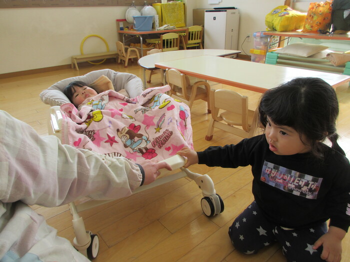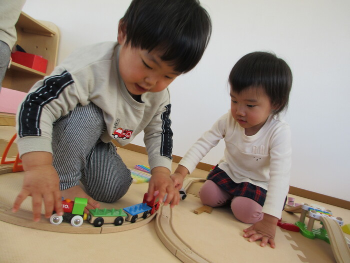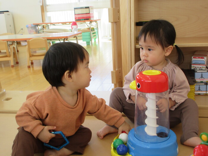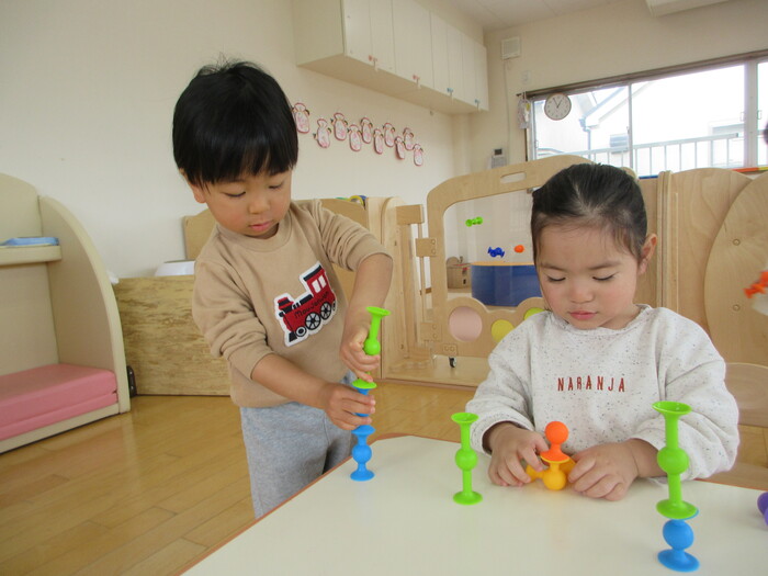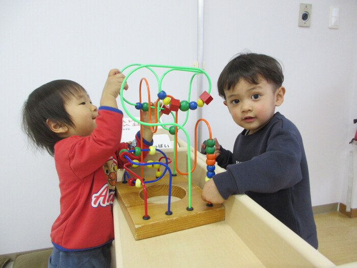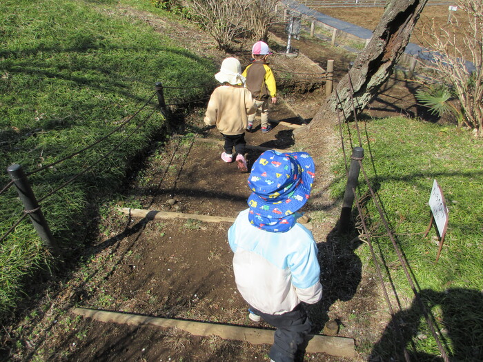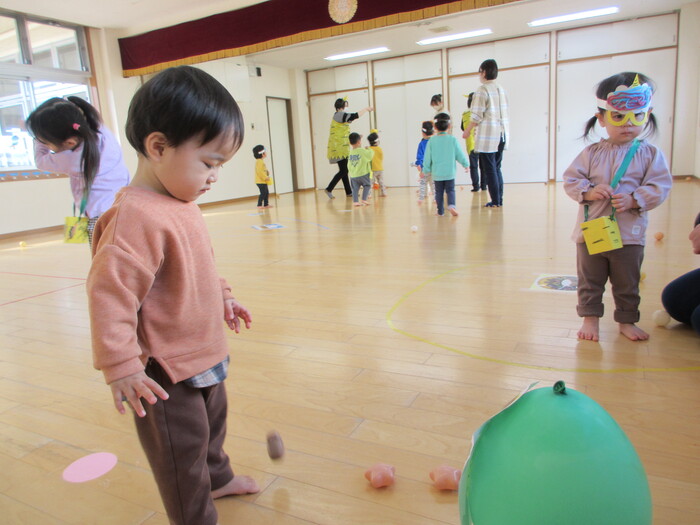 2月から新しいお子さんをお迎えし、なかよしルームの生活が始まりました 初めての保育園に不安を感じ泣いているお子さんもいましたが、気になる玩具や好きな遊びを通して少しずつ慣れてきました。 2月は一年で一番寒い時期ですが、寒さに負けず、園庭や屋上で沢山体を動かして遊びました。 3月になると暖かい日が増え、菖蒲園やぶどう公園などにお散歩に出かけ、沿道のプランターのお花や、公園の木々の花を見て春を感じながら遊ぶことができました。 お散歩に行かれない日も、園庭や屋上で元気に遊びました。 | ||