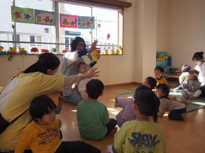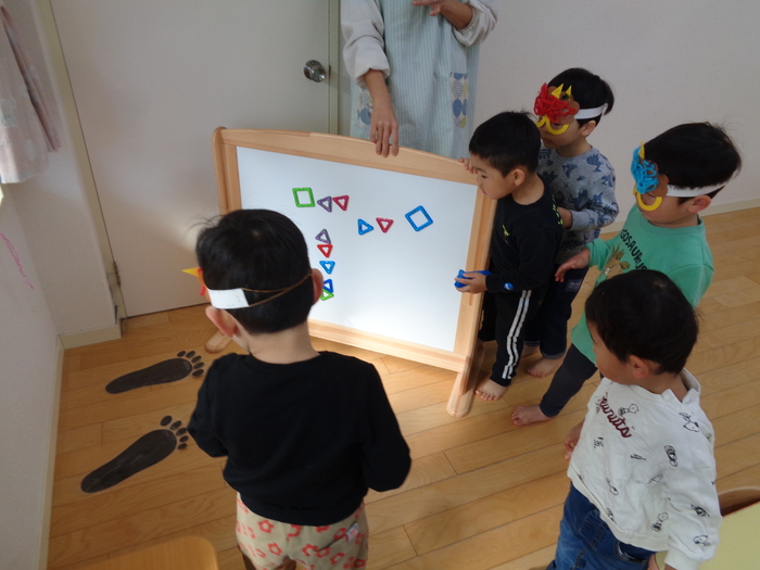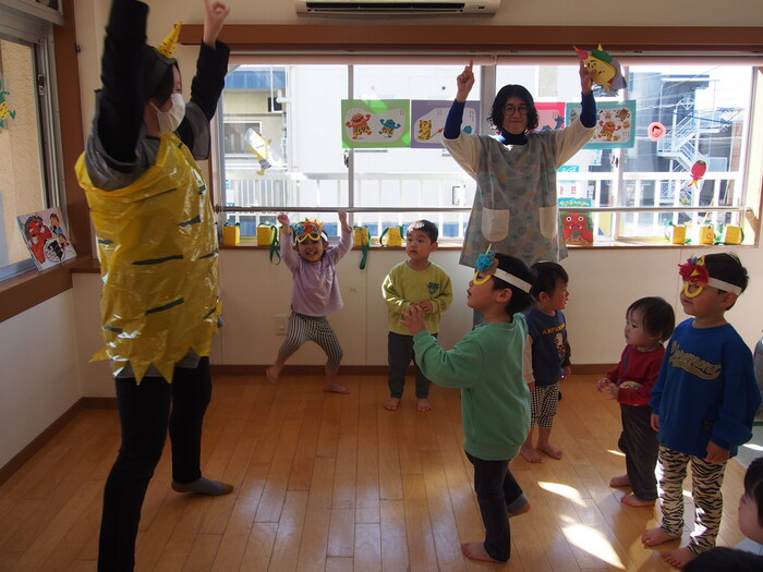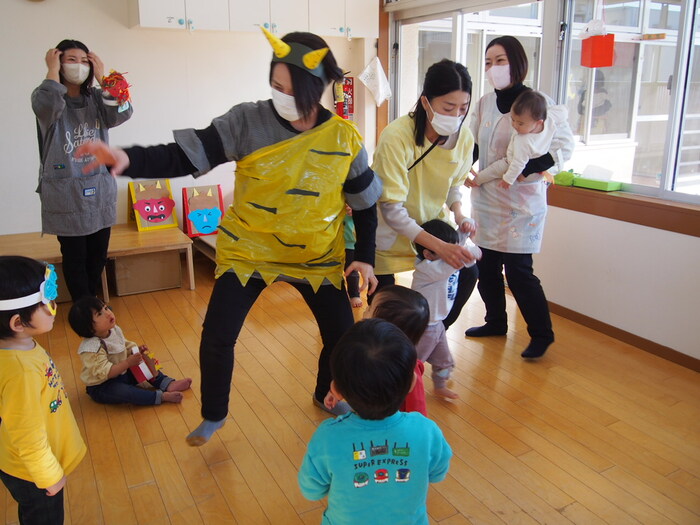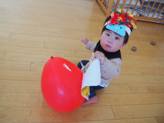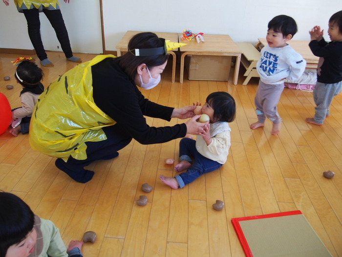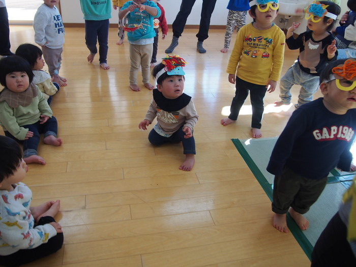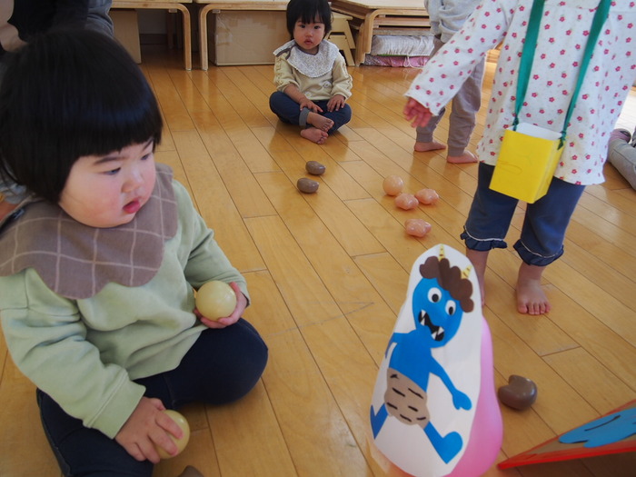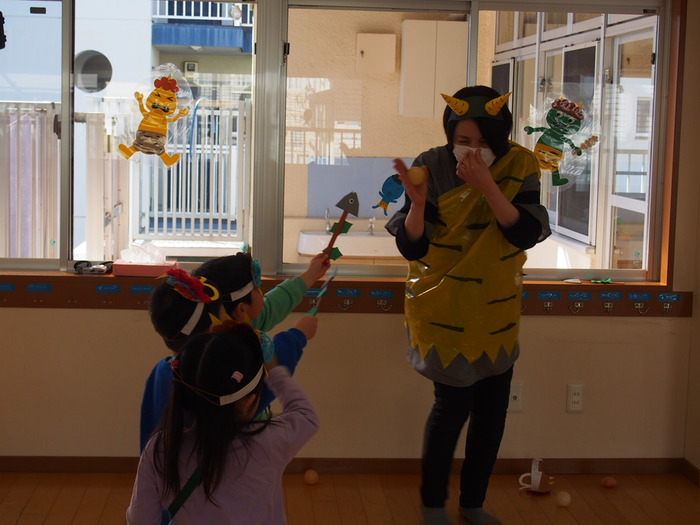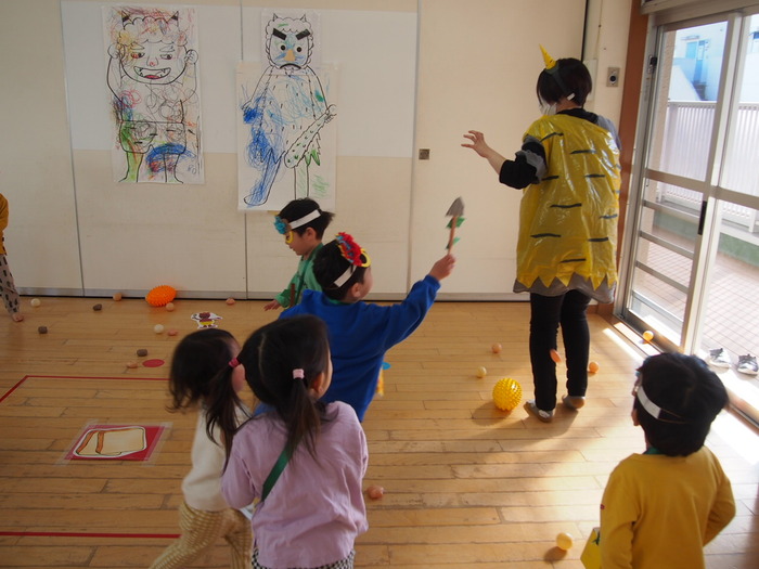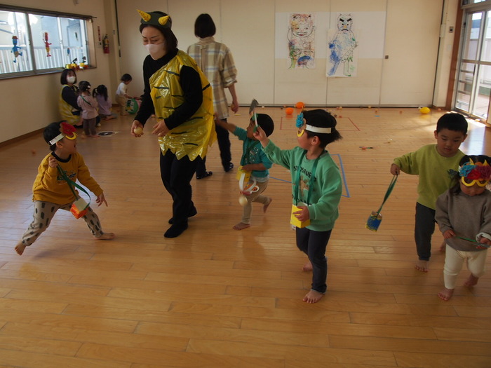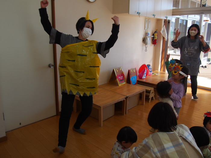 やはり鬼がやってきました!! でも、怖い鬼ではなく、愉快な鬼だったようで、みんなと一緒に『鬼のパンツ』の歌に合わせダンスをしているぞ!! | ||