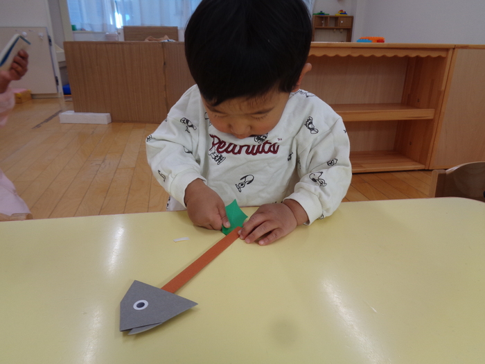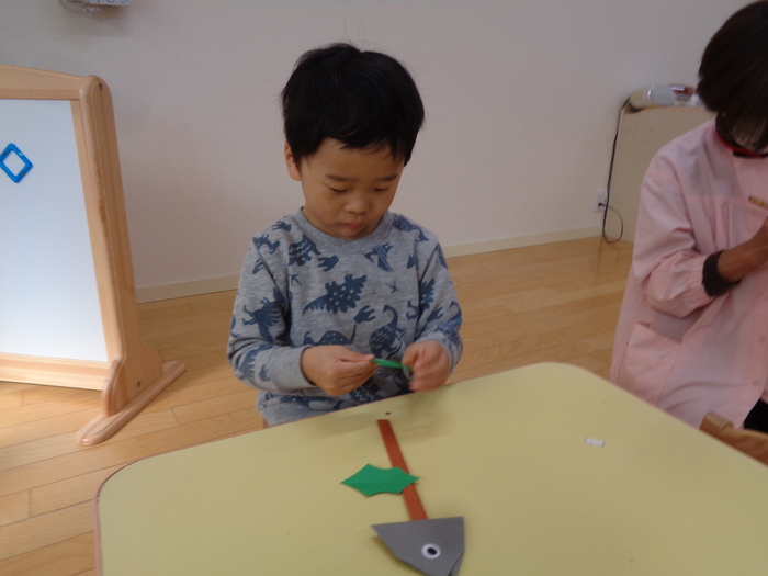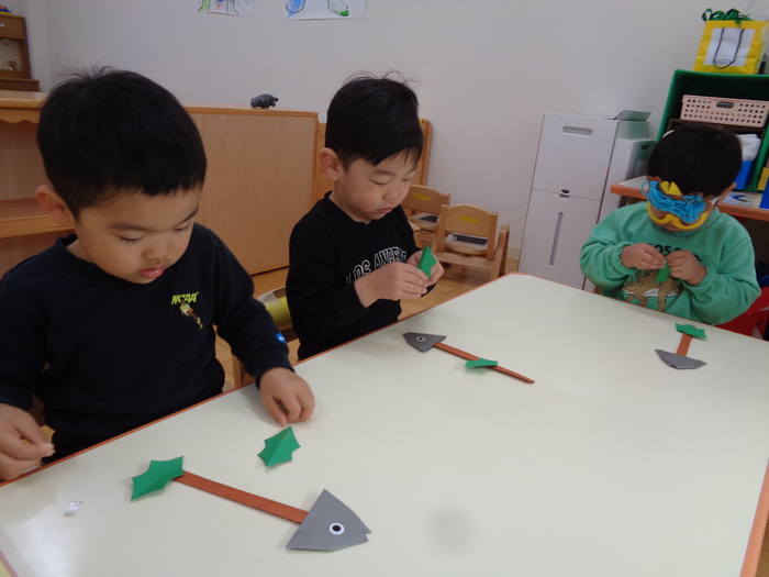 「こんな大きな足跡は鬼かもしれない!」「優しい鬼もいるかもしれないけど、怖い鬼が来たらどうしよう!」 そこで、鬼が嫌いなヒイラギの葉と鰯の頭を準備してくれた つぼみキッズ(2歳児)です!! | ||
