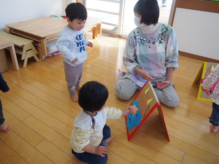 つぼみキッズ(0歳児)は「あなたは誰なの?」という表情で、初めて見る鬼にキョトンとしていますね | ||