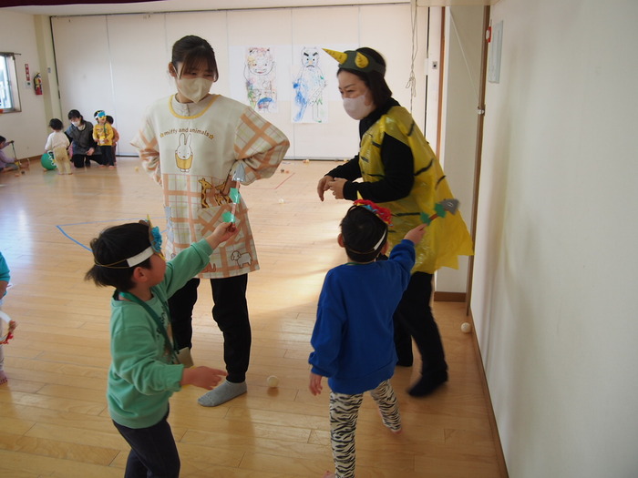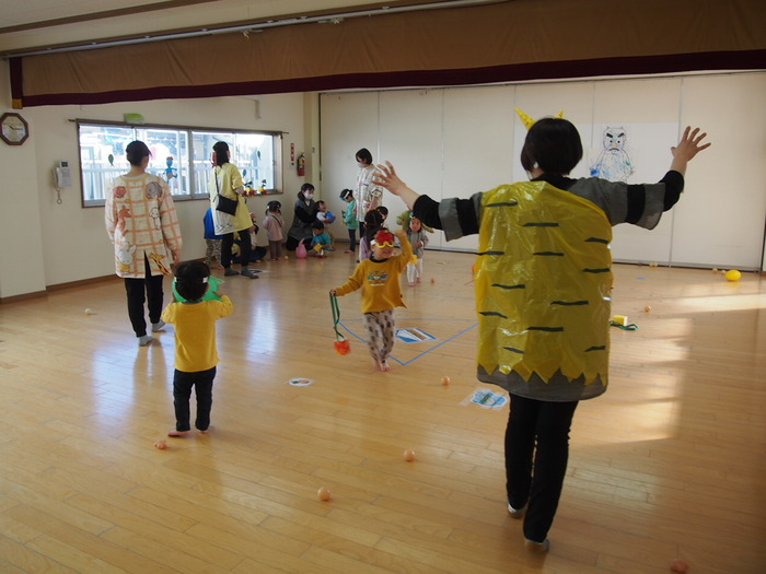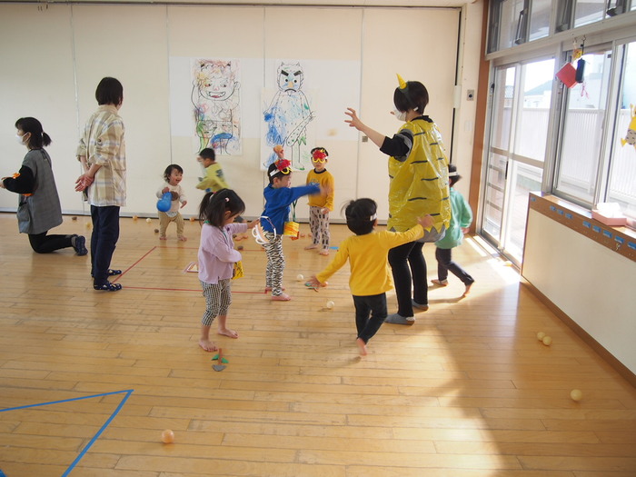 広~いホールへ移動してきた鬼たち!! 「僕たちがやっつけるぞ~!!」とつぼみキッズ(2歳児)が大活躍です!! 愉快な鬼でもつぼみキッズにとってはちょっぴり怖い存在だったようですね | ||