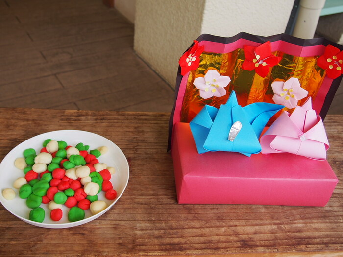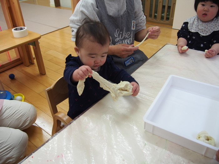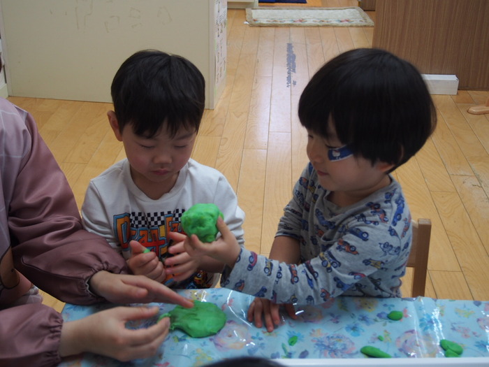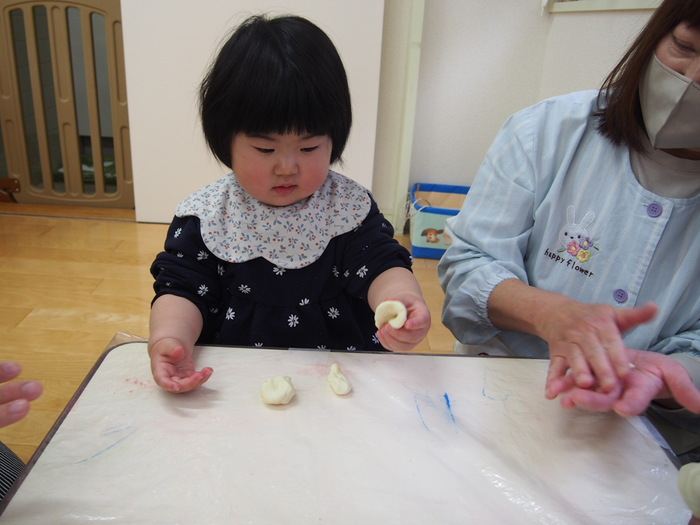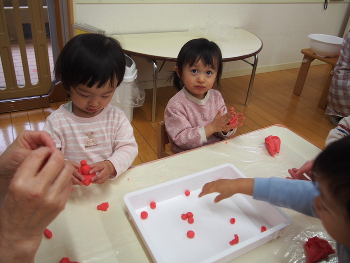 🌸みんなでひな祭りの話を聞いた後は、3色の小麦粉粘土で雛あられを作りました🌸 | ||