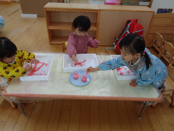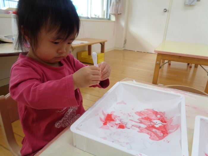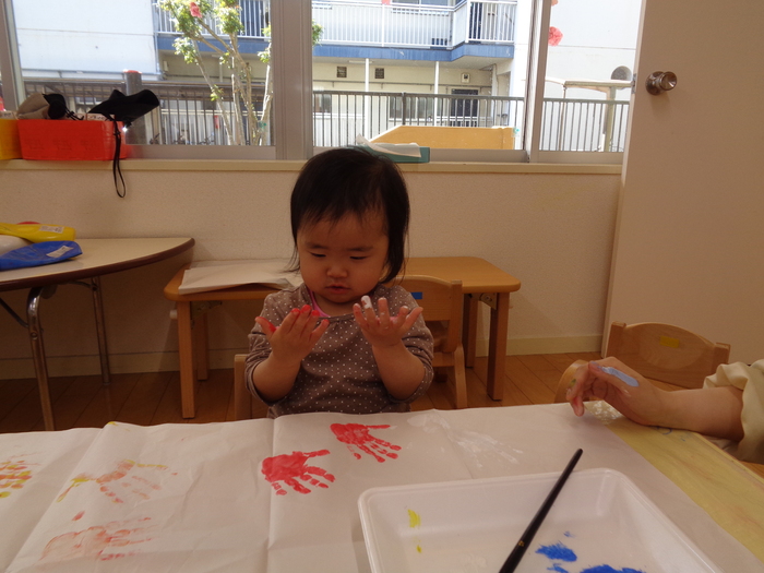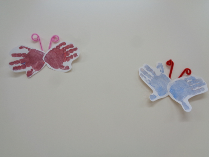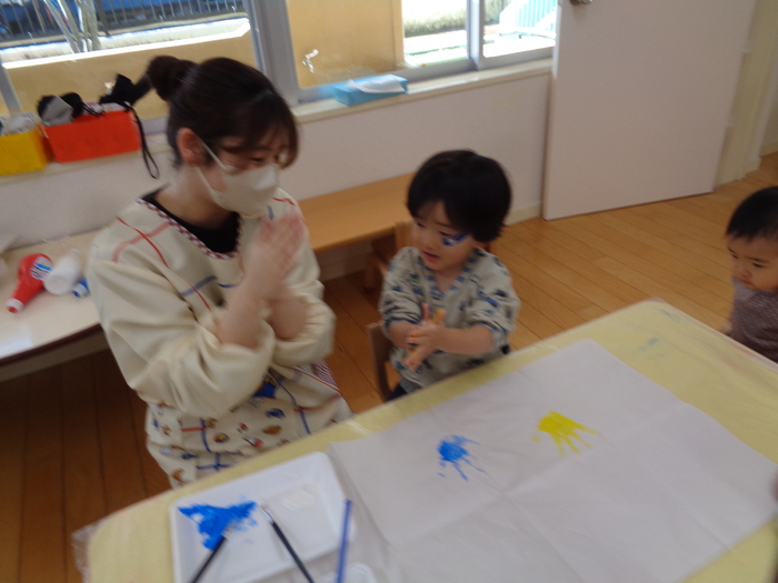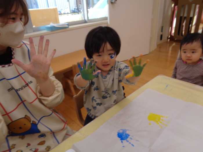 「混ぜたら何色になるかな?」 手のひらで色を混ぜてスタンプ! 綺麗なちょうちょになりました | ||