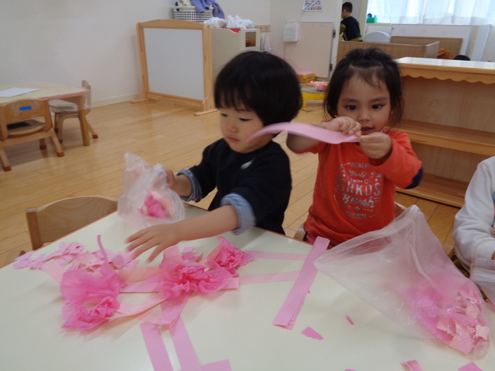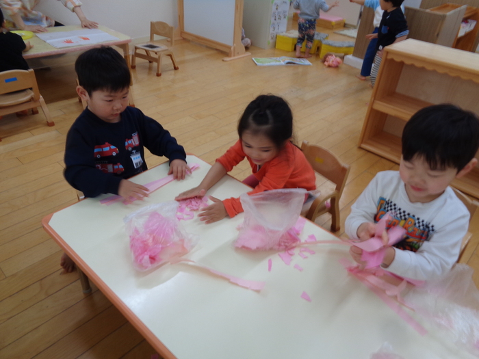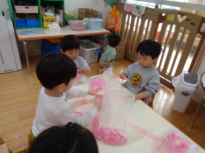 ピンク色の紙をちぎってちぎって、、、 | ||