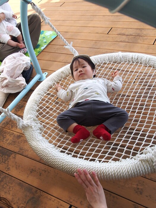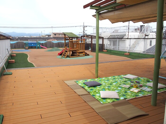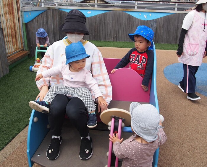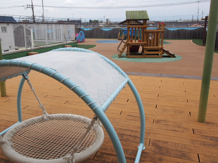大南つぼみ保育園は屋上でも遊んでいただけます 屋上には滑り台や車・フットカーなどの遊具もあります 今年度新しくEGGブランコという遊具も入りました! | ||