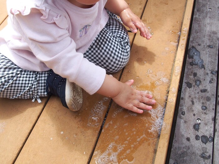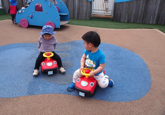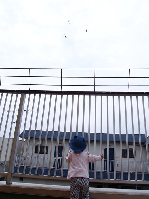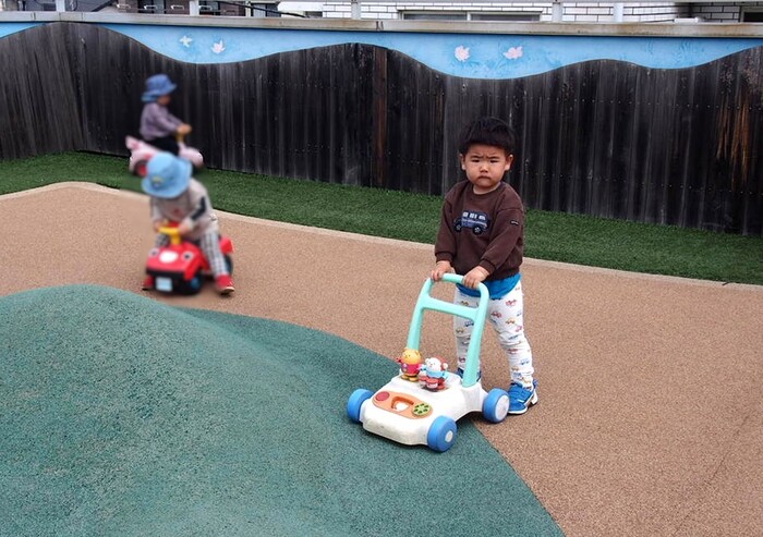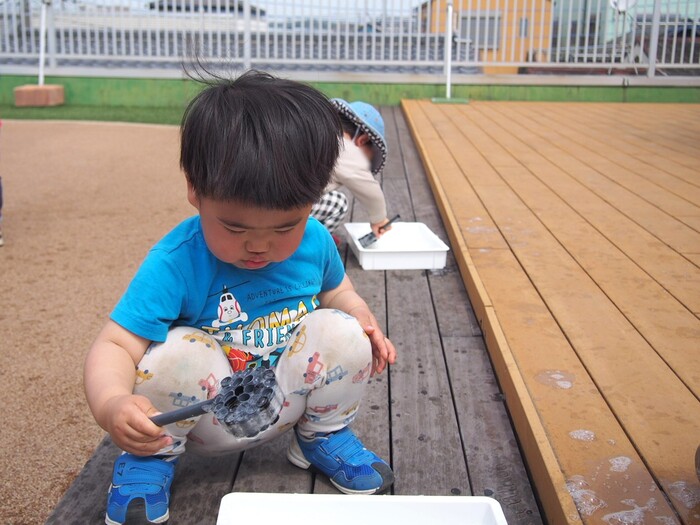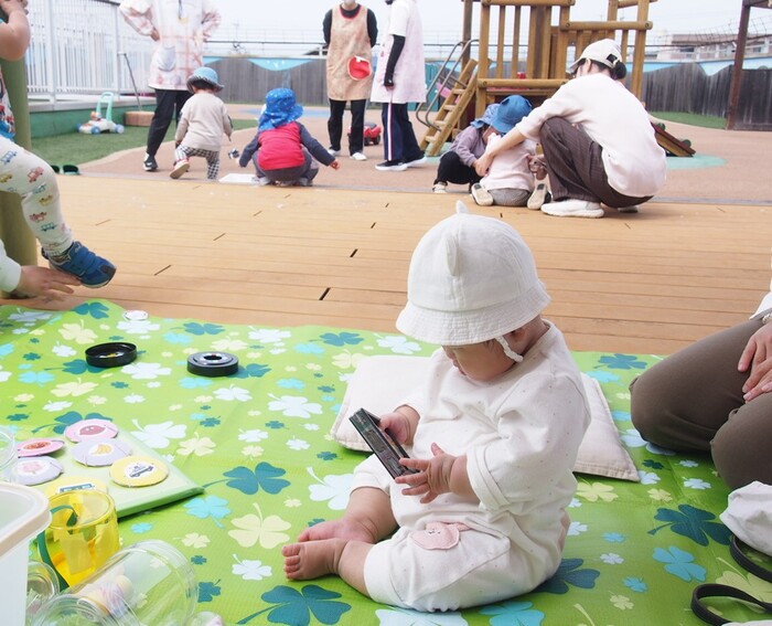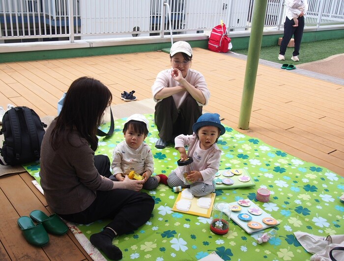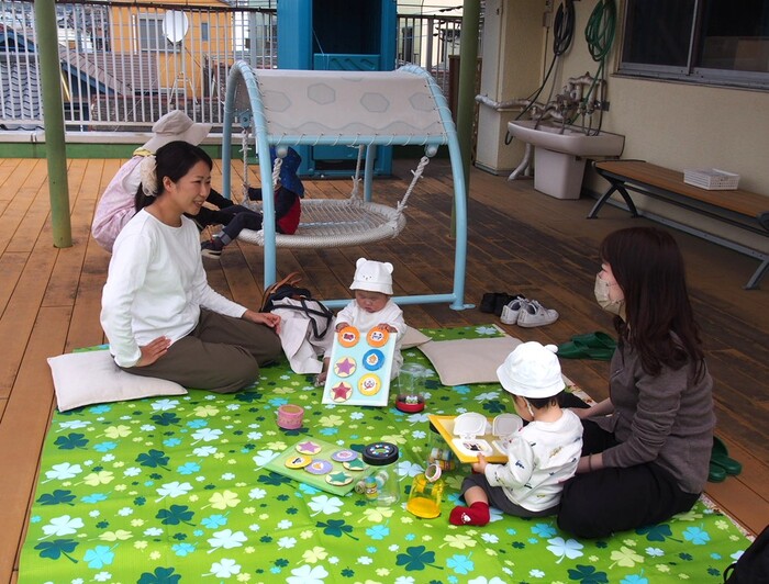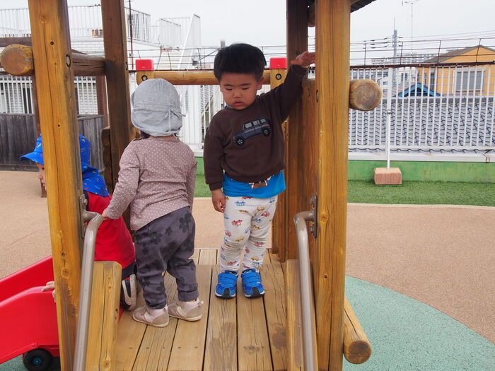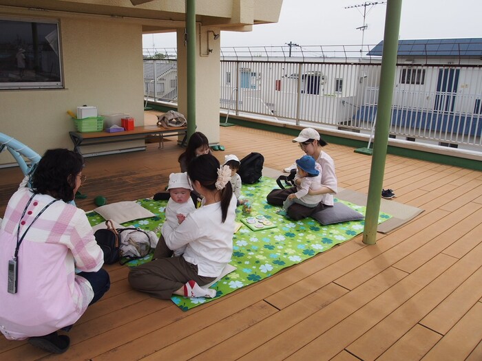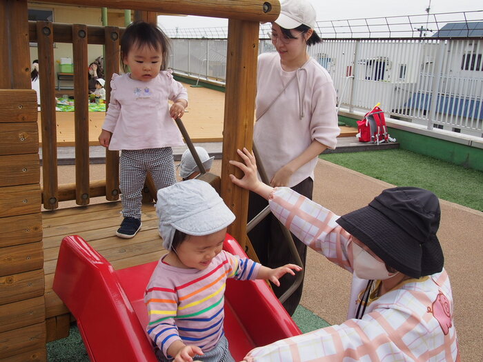 つぼみキッズの2歳児と一緒に屋上で触れ合いながら遊びました | ||