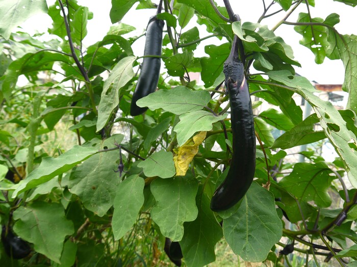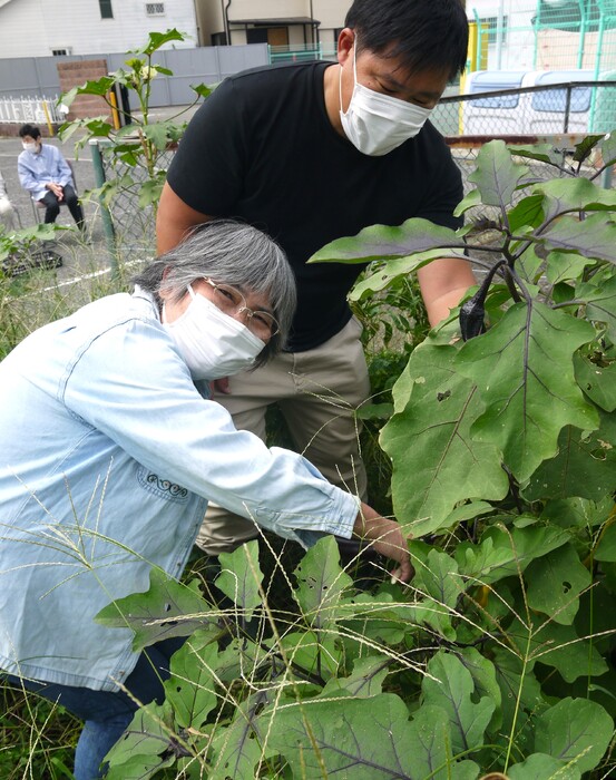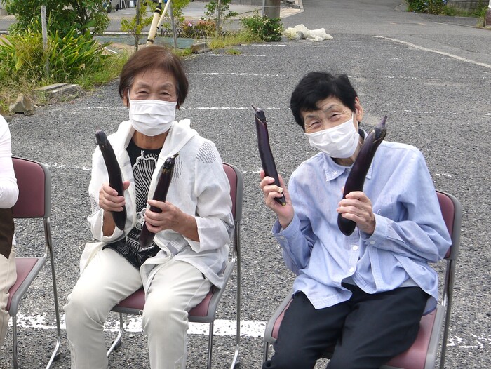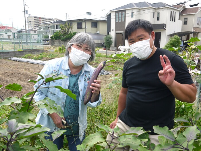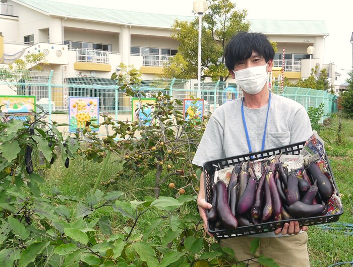 こちらは、当法人の畑でナスビの収穫のご様子です