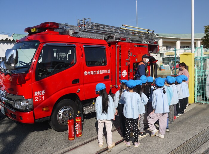 消防避難訓練を行いました!子ども達は、消防車に興味津々です!