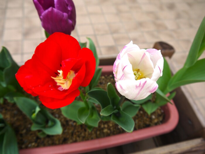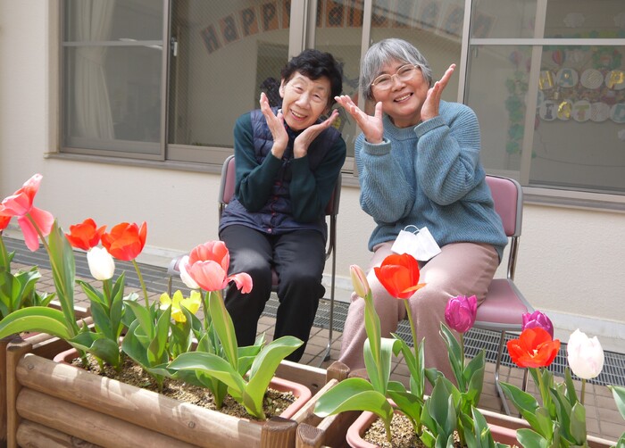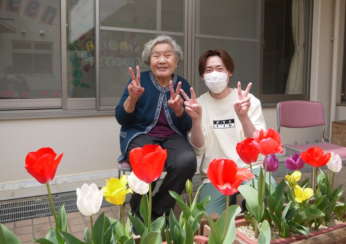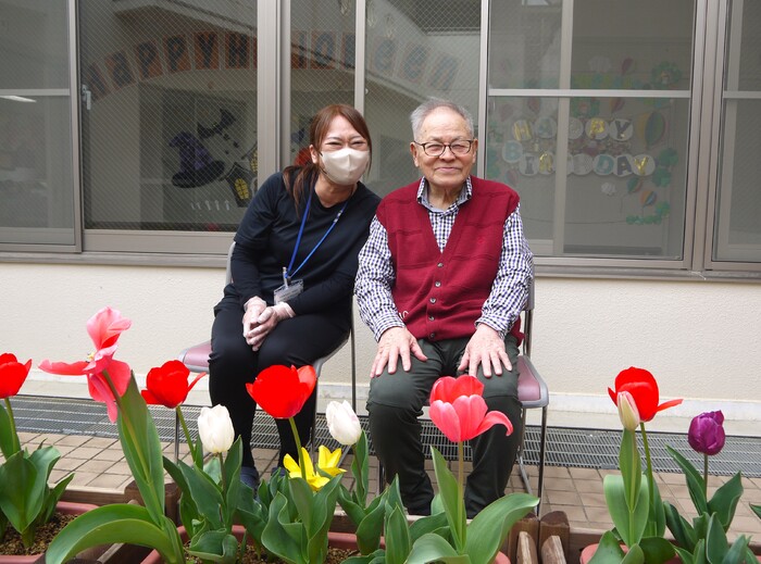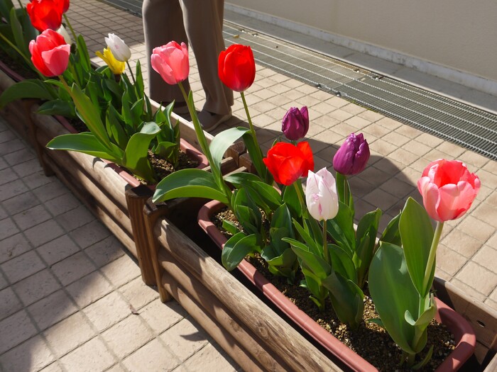 中庭でご利用者様が球根を植えておられ、毎日少しずつ成長して、ついに花が咲きました♪