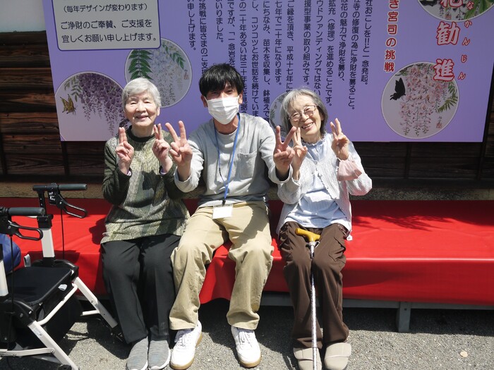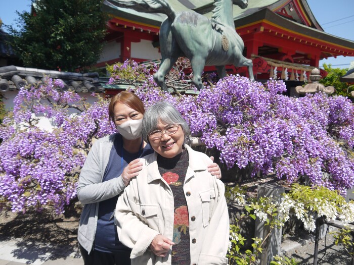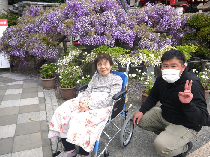 「お天気も良いし、藤の花もたくさん咲いていて、最高ですね」「藤の花の香りも本当に良いですね」