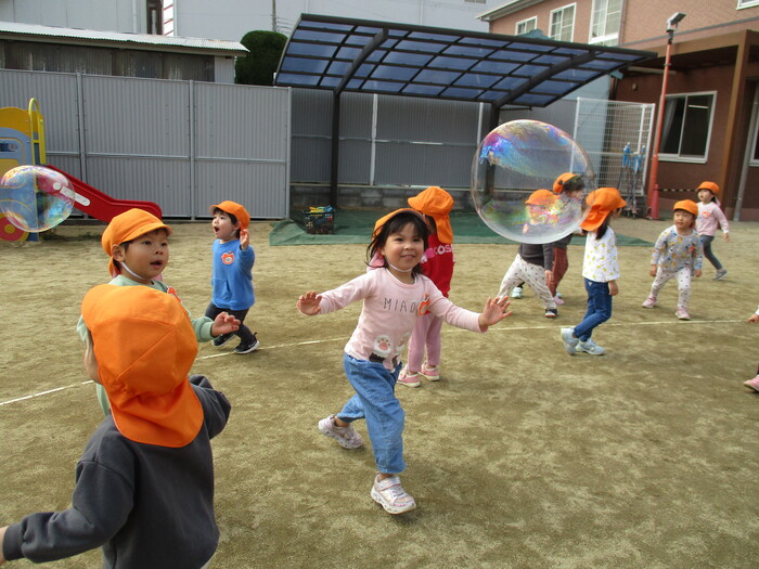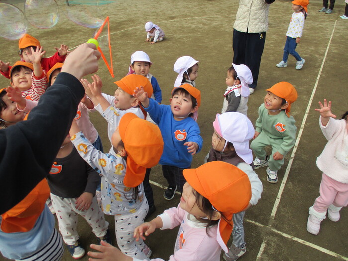 お友達と手をつないだり、ボールやフープ、シャボン玉を追いかけて楽しんでいましたよ。