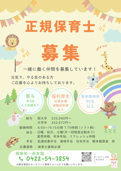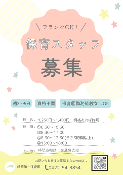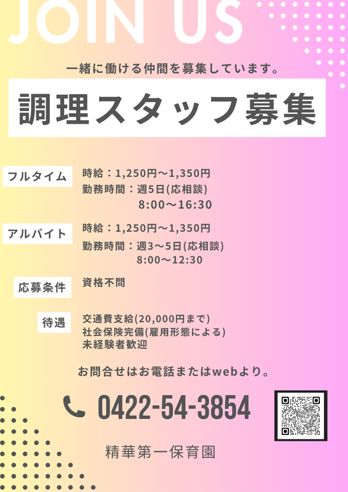 ●保育士(常勤) ●保育スタッフ(非常勤) ●栄養士・調理師(常勤) ●調理フタッフ(非常勤) 現在上記の募集をしています。 下記のポスター(3枚あります)を それぞれご確認ください。 園内の見学だけでも、大歓迎です。お気軽にお問合せください。 | ||