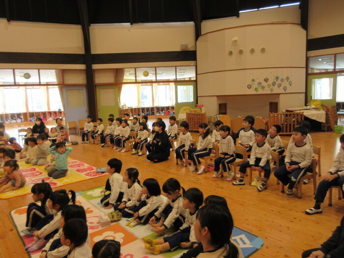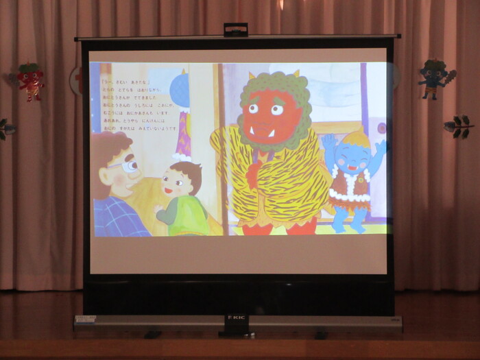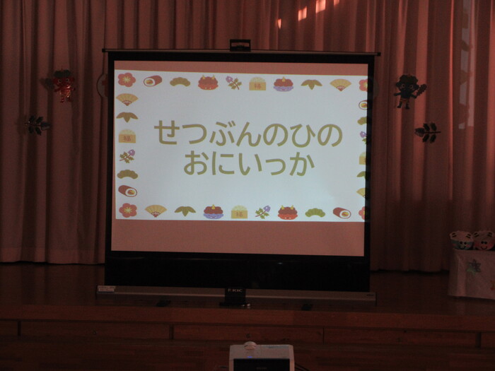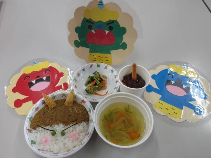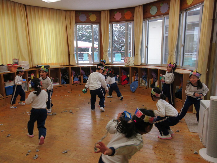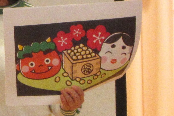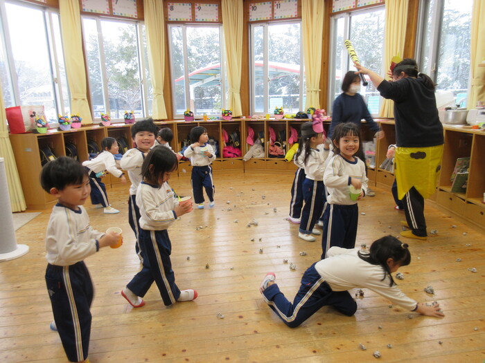 お部屋に戻って 豆まきもしました。 可愛い鬼さんがお部屋に来ました♪ | ||