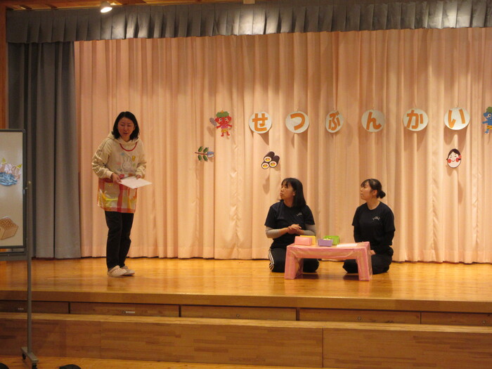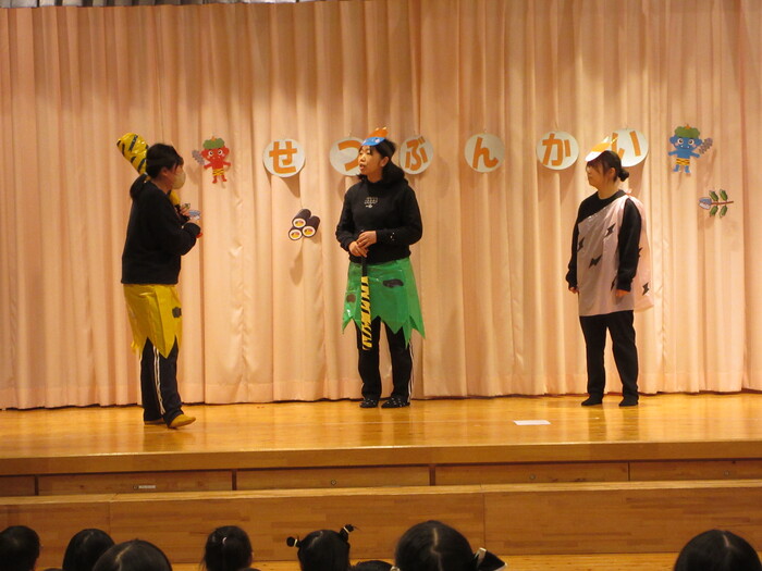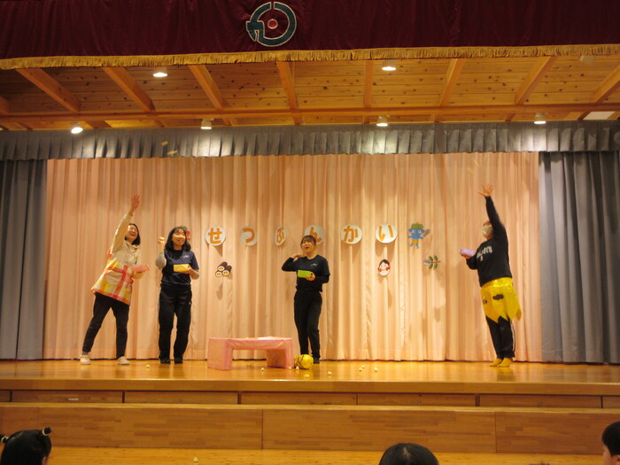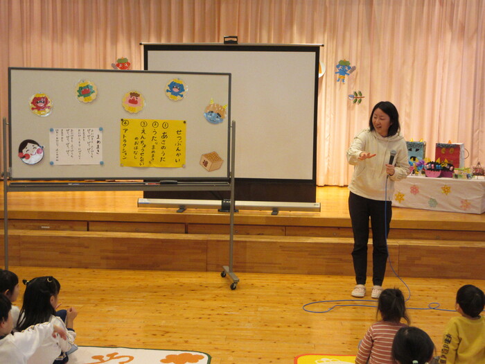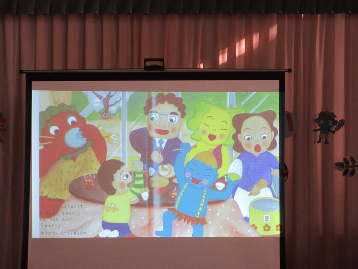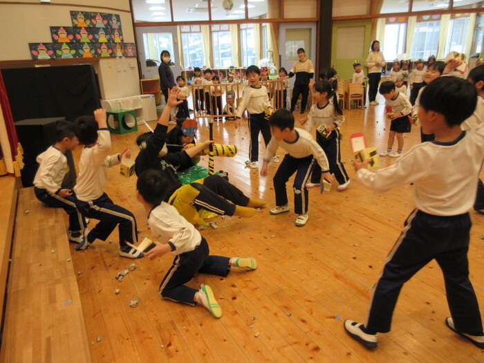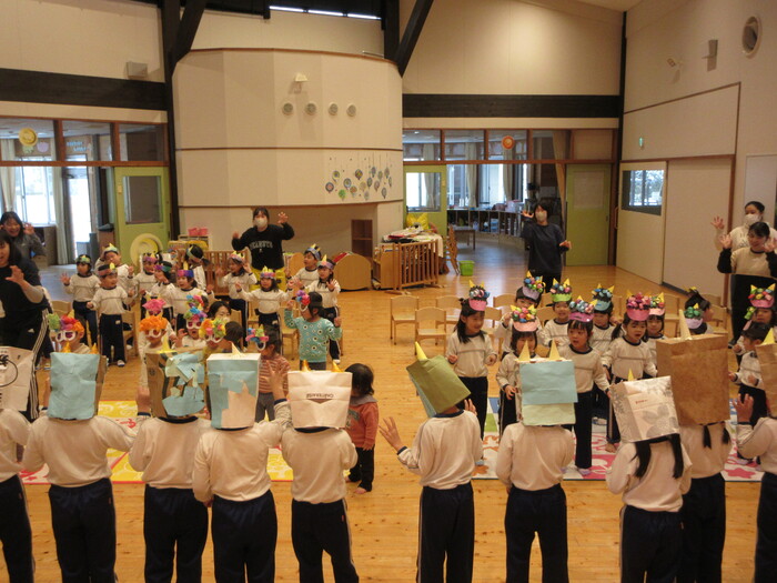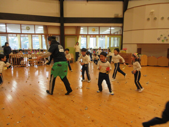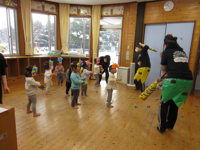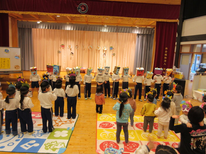 みんなでお面を着けて 「鬼のパンツ」を踊ったよ♪ | ||