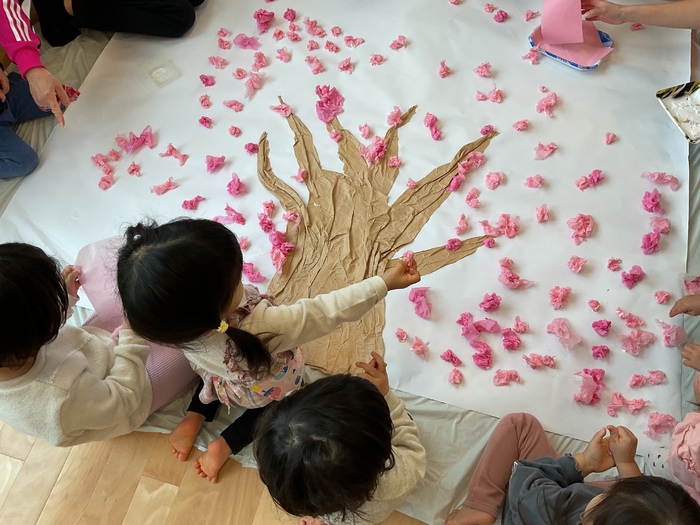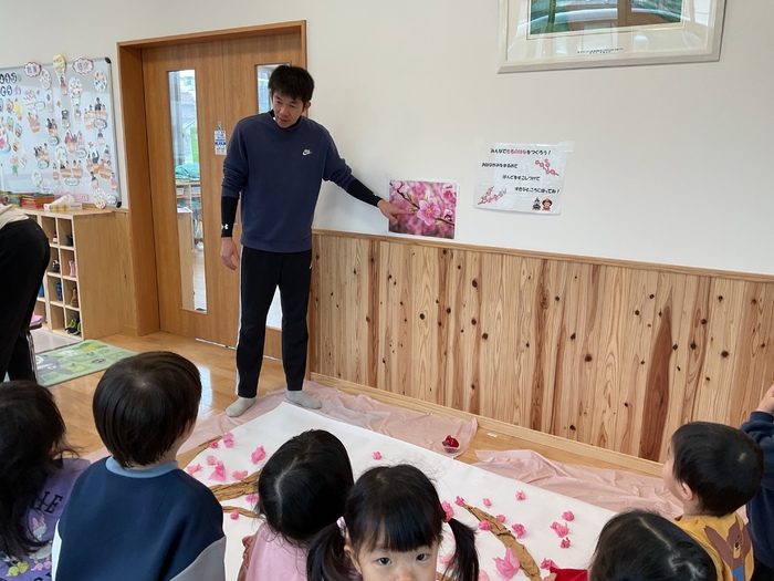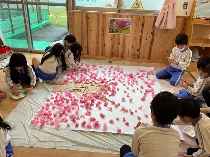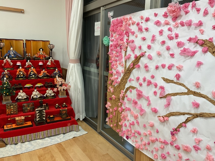 玄関ホールでは「みんなで桃の花を咲かせよう!」と大きな木にお花を咲かせてくれました!