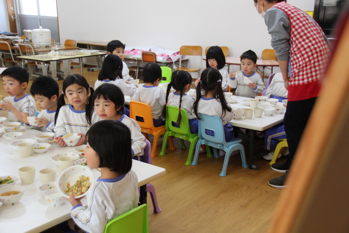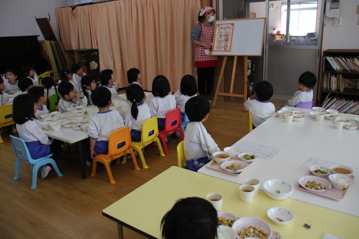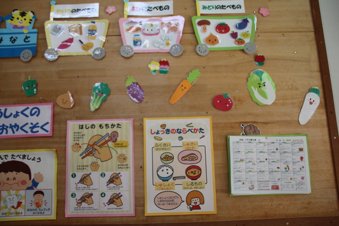 ランチルームの「たべもの列車と一緒だね」と絵を見ながら給食を食べていました。