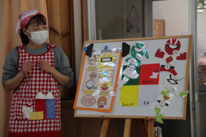 「主食は黄色でエネルギーになるたべもの」「主菜は赤色でからだをつくるたべもの」「副菜は緑色でからだの調子を整えるたべもの」という事をレンジャーに例えて教えてもらいました。