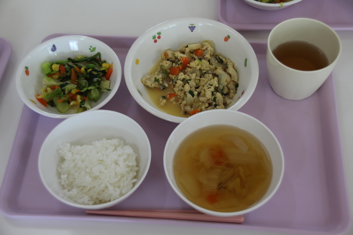 今日の給食は「ご飯、炒り豆腐、小松菜のコーン和え、白菜のすまし汁」です