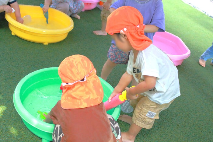 暑さと相談しながら過ごしました。暑さ指数が高くない日は迷わず水あそびへ!水鉄砲を使って楽しんでいました♡暑さ指数が高い日はお部屋でゆったり過ごしたり、氷遊びで冷たさを感じたり!夏ならではの遊びも楽しめました☆ | ||