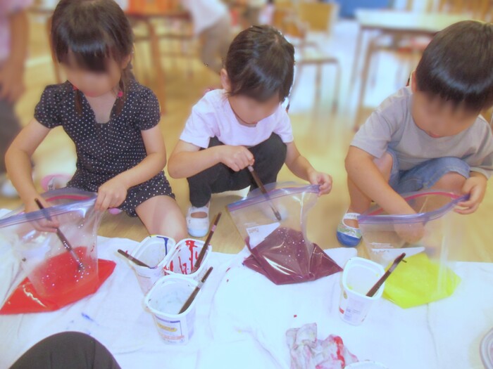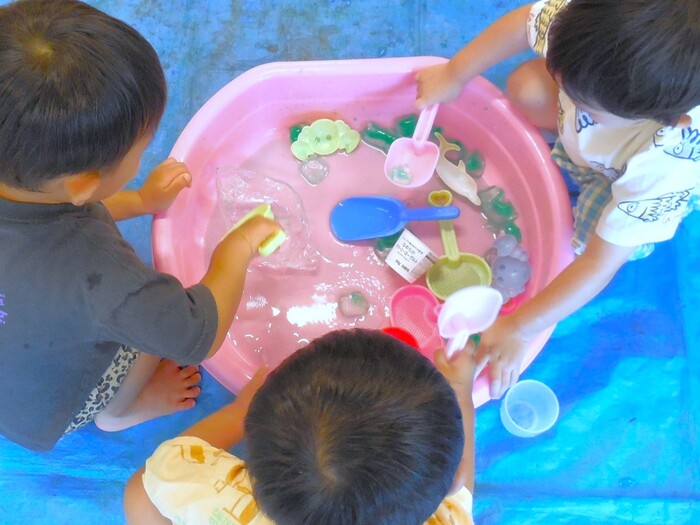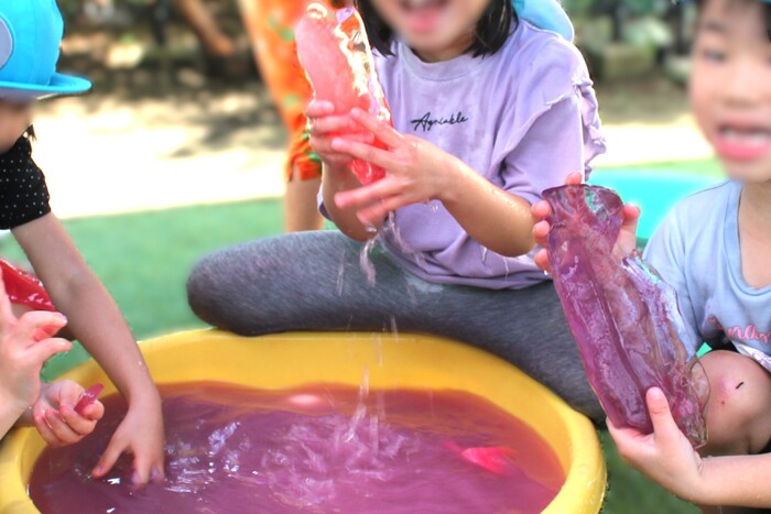 好きな色を使っての氷づくり!「赤」「紫」「緑」などなど・・・混ぜて作った色とりどりの氷に子ども達は大興奮でした♡別日にはその氷を使って遊びました。「冷たいね」「あっという間に溶けちゃった!」夏ならではの楽しい感触遊びになりました♪ | ||