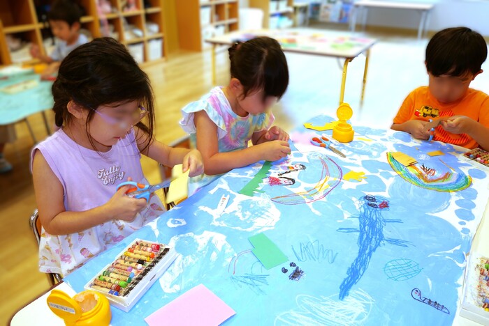 水色に塗った模造紙。「何だか海みたいだね!」「空の色だよ!」様々な『水色のもの』を口にしながら、テーブルごとに相談して一つのテーマに絞りました。お絵描きしたり画用紙で形を作って貼ったりと楽しんでいました。 | ||