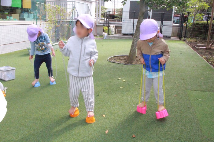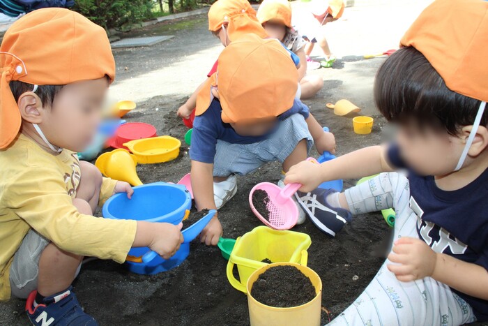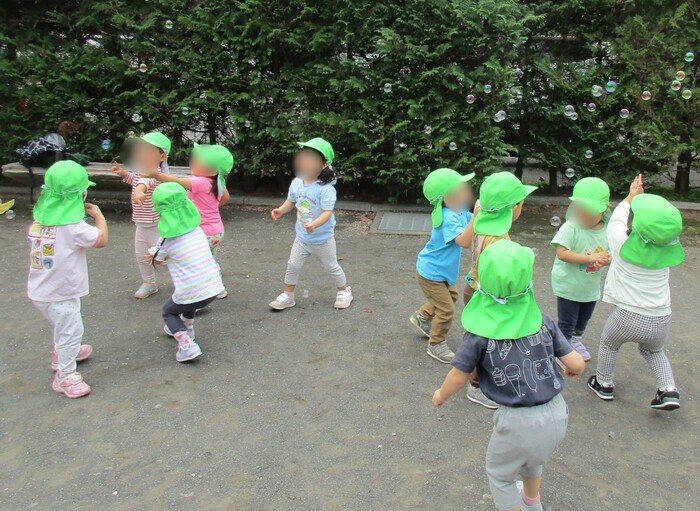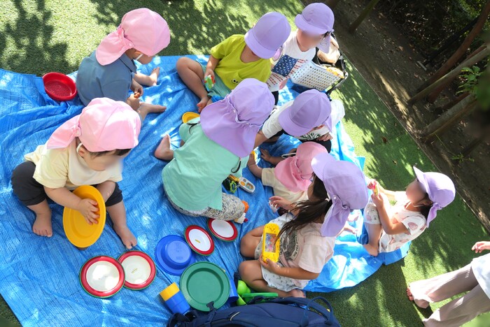 まだまだ暑い日もありますが、少しずつ秋の気配が・・・!戸外遊びを楽しめる時期になりましたね。 中庭遊びでは交代のタイミングで、触れ合う機会もありました♡幼児クラスのお兄さんお姉さんに声を掛けられると、嬉しそうに笑顔を見せる乳児クラスの子ども達でした☆ | ||