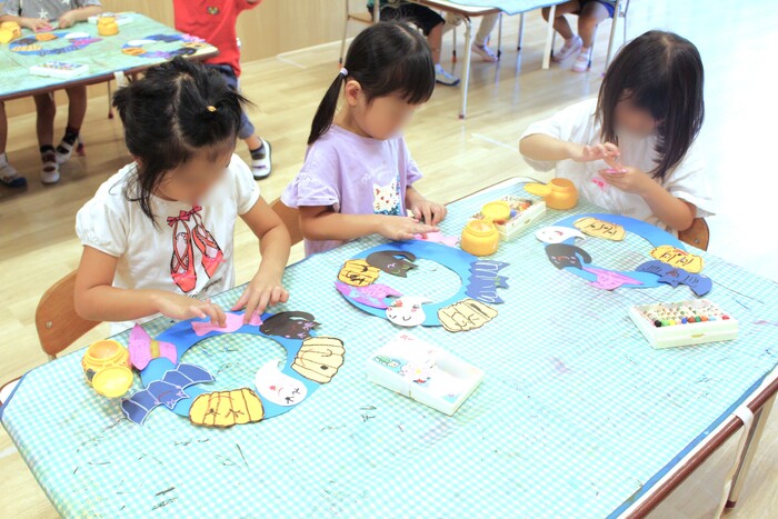 ハロウィンに向けての制作では、お部屋に飾るリースや当日着けるお面、お菓子交換用のお菓子作りをしました。それぞれに個性が出て、とても可愛らしく仕上がりました♡ | ||