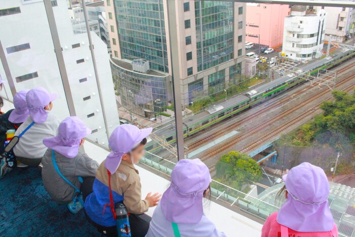 水筒を持って出発!市役所にお邪魔しました♡展望フロアからの景色は最高!!電車が走っているのを見られて大喜びの子ども達でした☆3・4歳児クラスの子ども達のお弁当はお留守番!保育園に帰ってから食べました♡お腹空いたよね!みんなモリモリ食べていました!