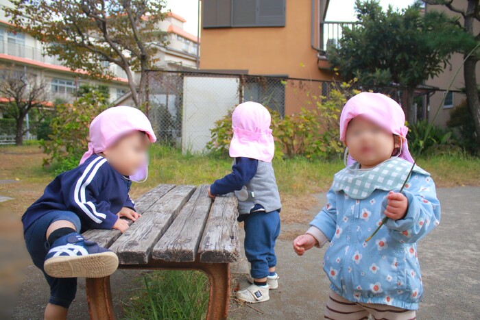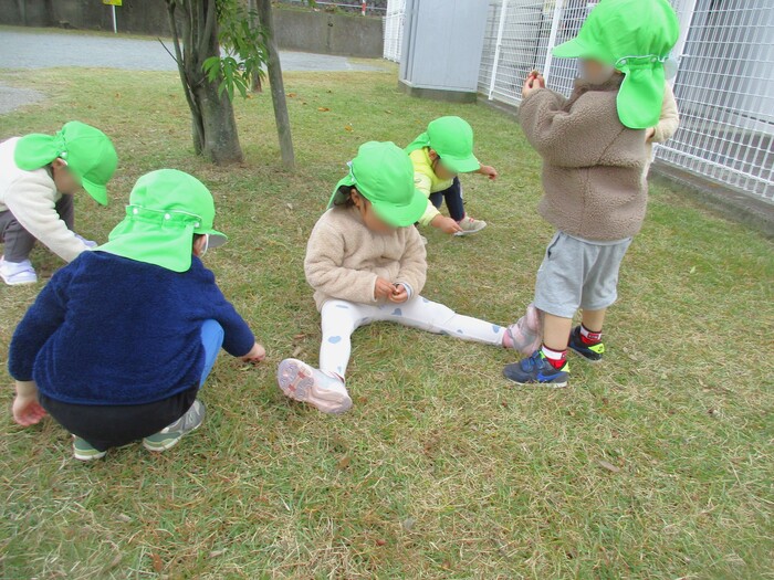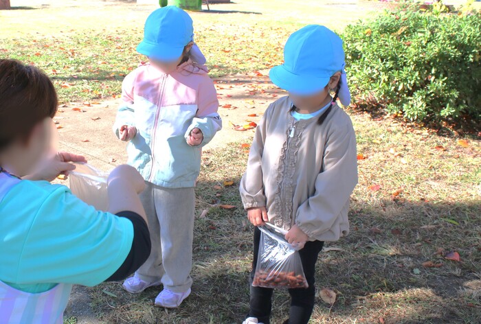 落ち葉やどんぐり拾い等、秋ならではの自然との触れ合いも出来ました♡ 拾って来たドングリは何になるのかな!?各クラス制作や遊びに取り入れていました☆ 冬が来て寒くなる前に、戸外遊びをたくさん楽しみたいと思います♪ | ||
