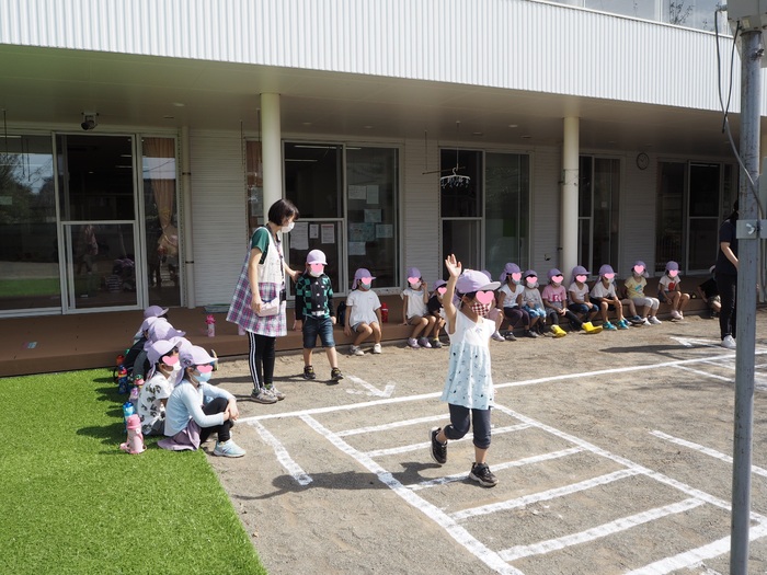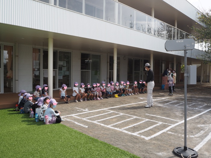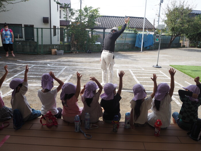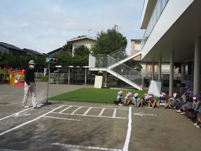 交通ルールを守る大切さを学び、信号機を見て正しく横断歩道を渡る練習をしました。