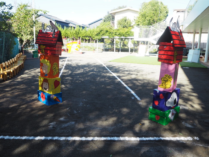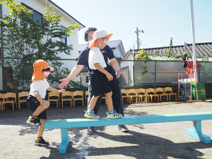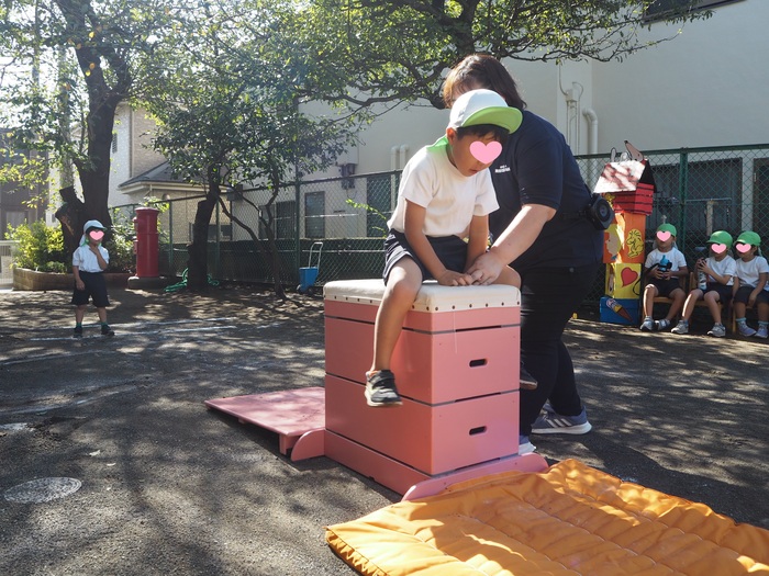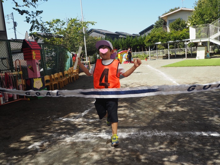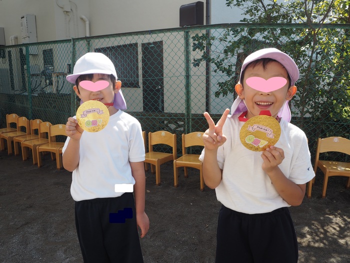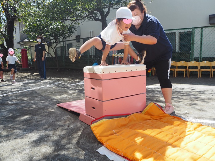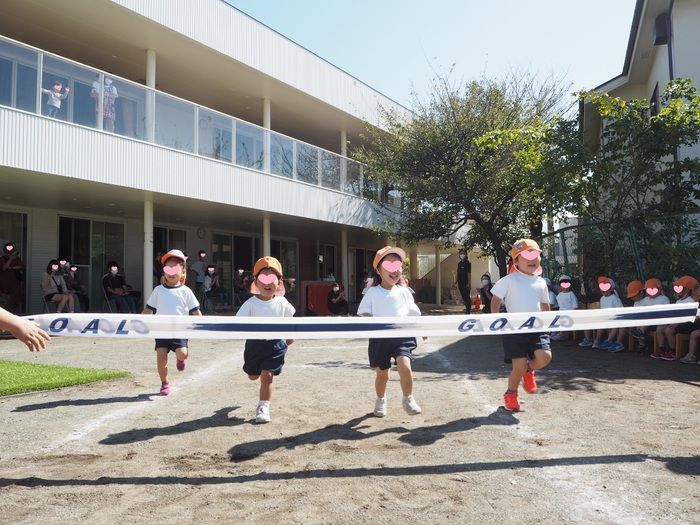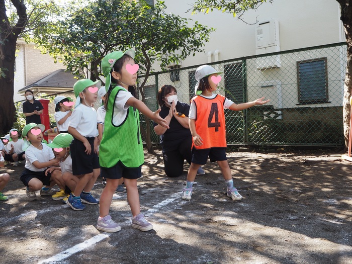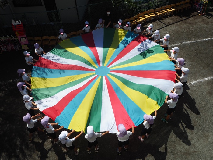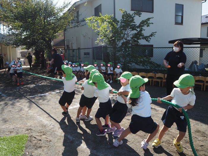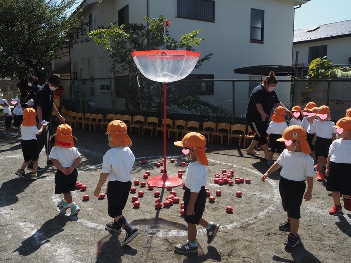 台風一過の中、ひまわり組(4歳児クラス)、すみれ組(3歳児クラス)、ゆり組(5歳児クラス)の順に密を避けて生活発表(運動あそび)を行いました。