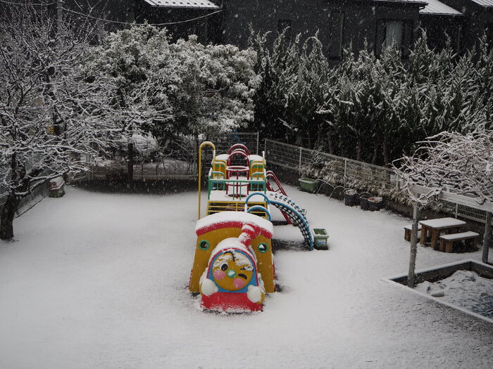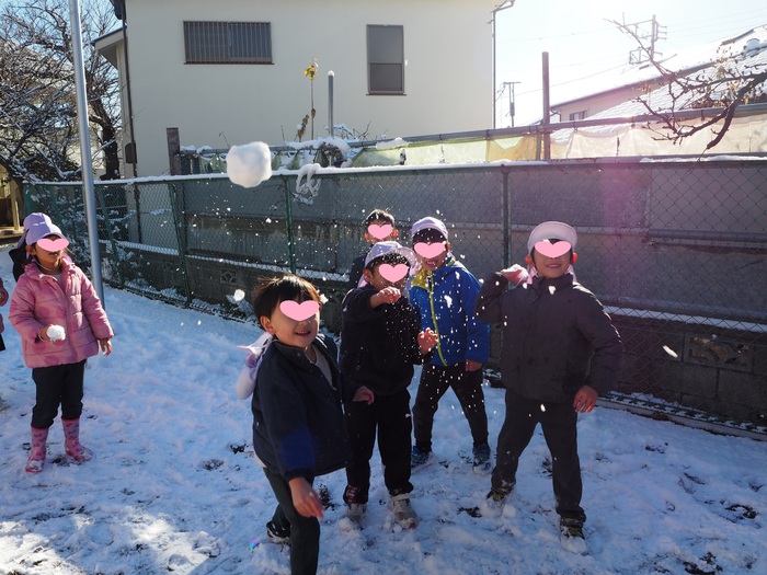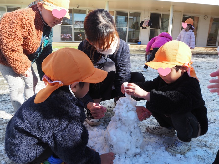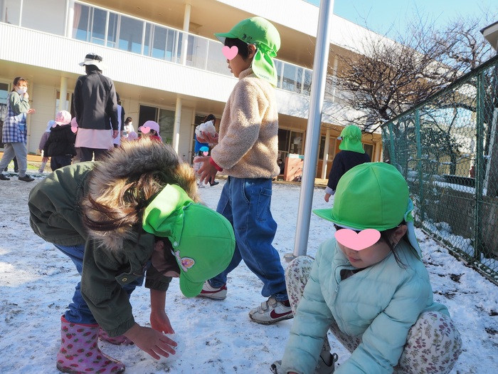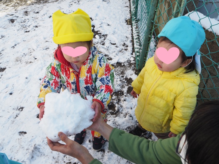 明けましておめでとうございます。 「オミクロン株」の感染拡大が懸念されますが、徹底した感染対策を講じつつ、子どもたちが楽しい保育園生活が送れるように職員一同協力して頑張ります。 降り積もった雪で雪遊びを楽しみました。子どもたちは、「つめたいね」「ふわふわだね」と雪の感触を楽しんでいました。 | ||