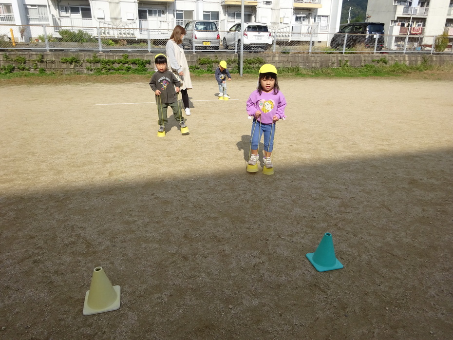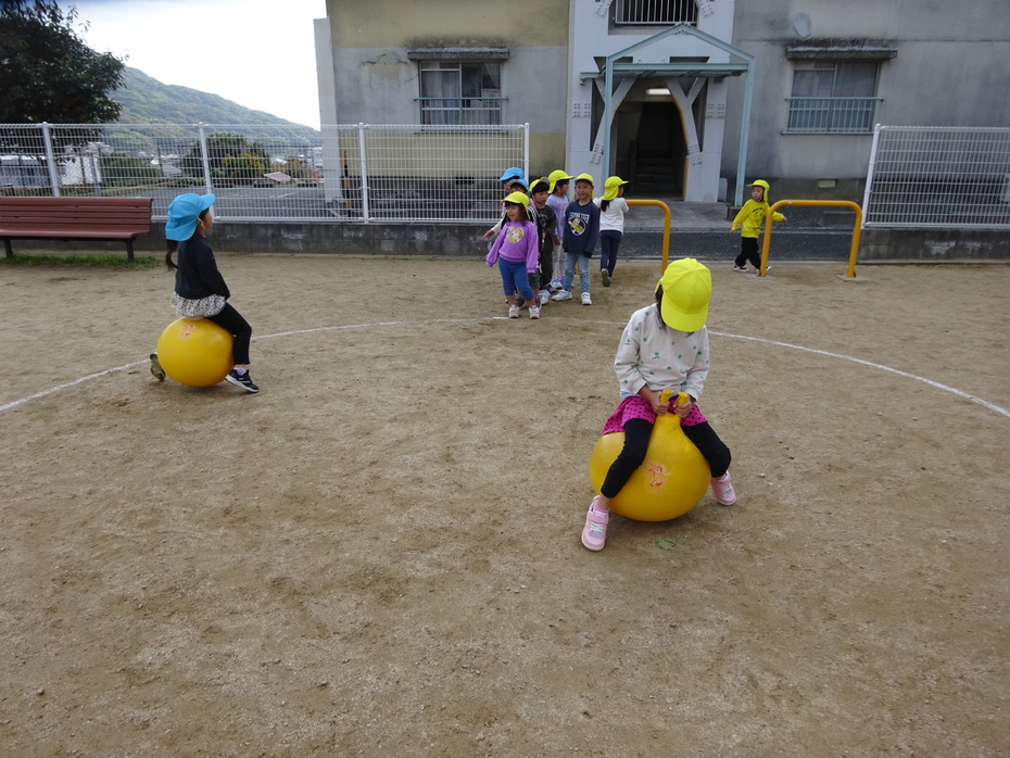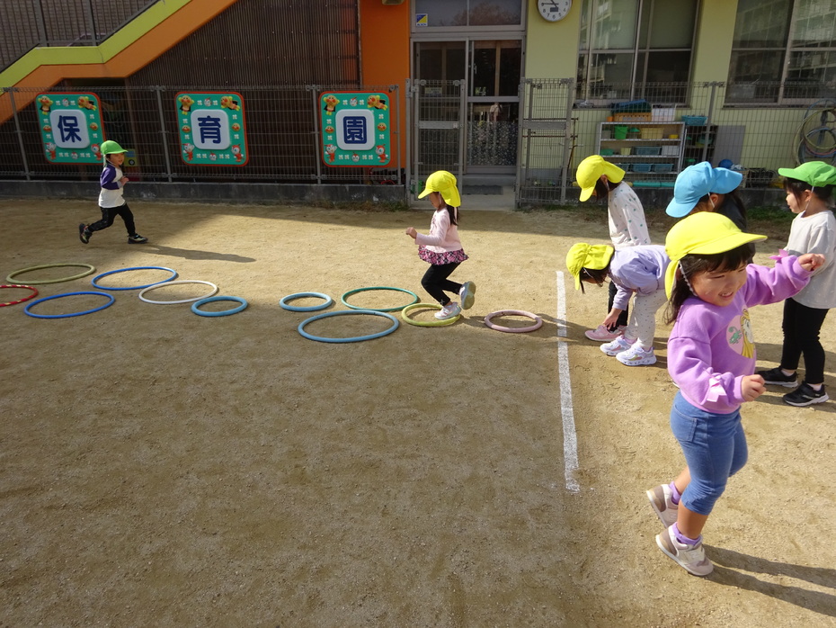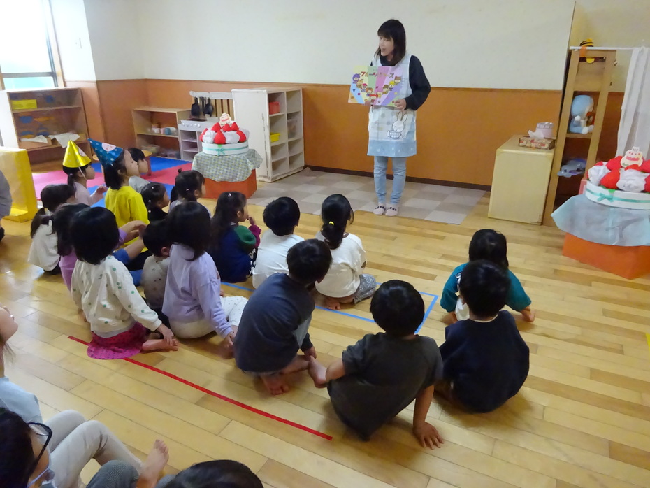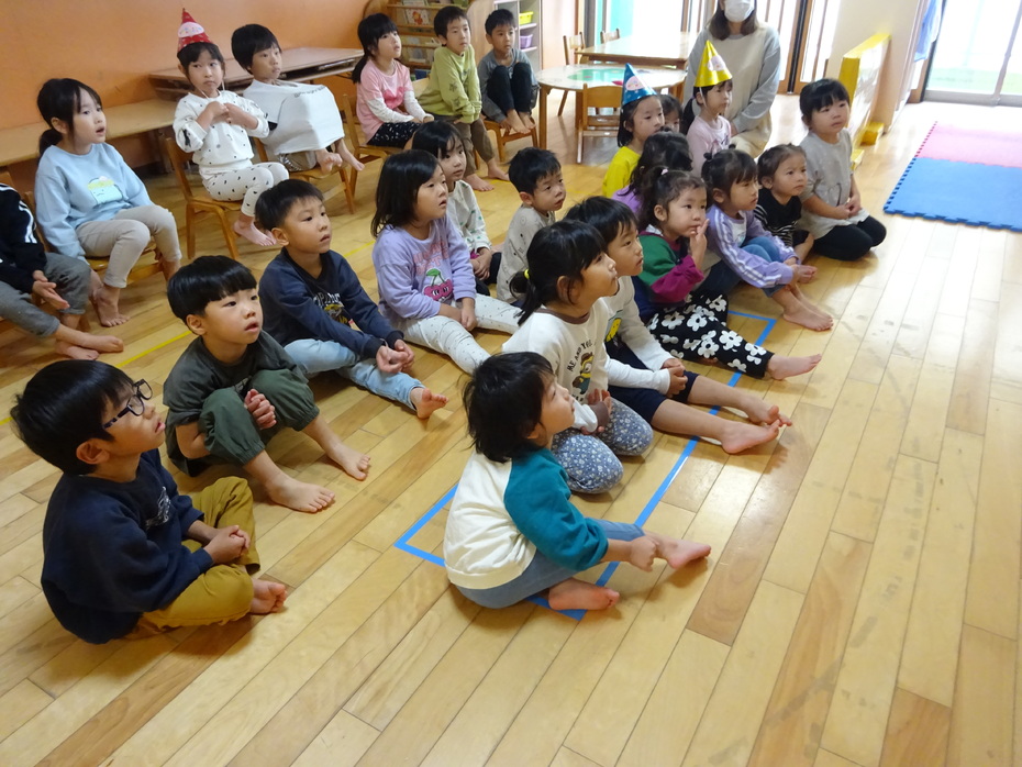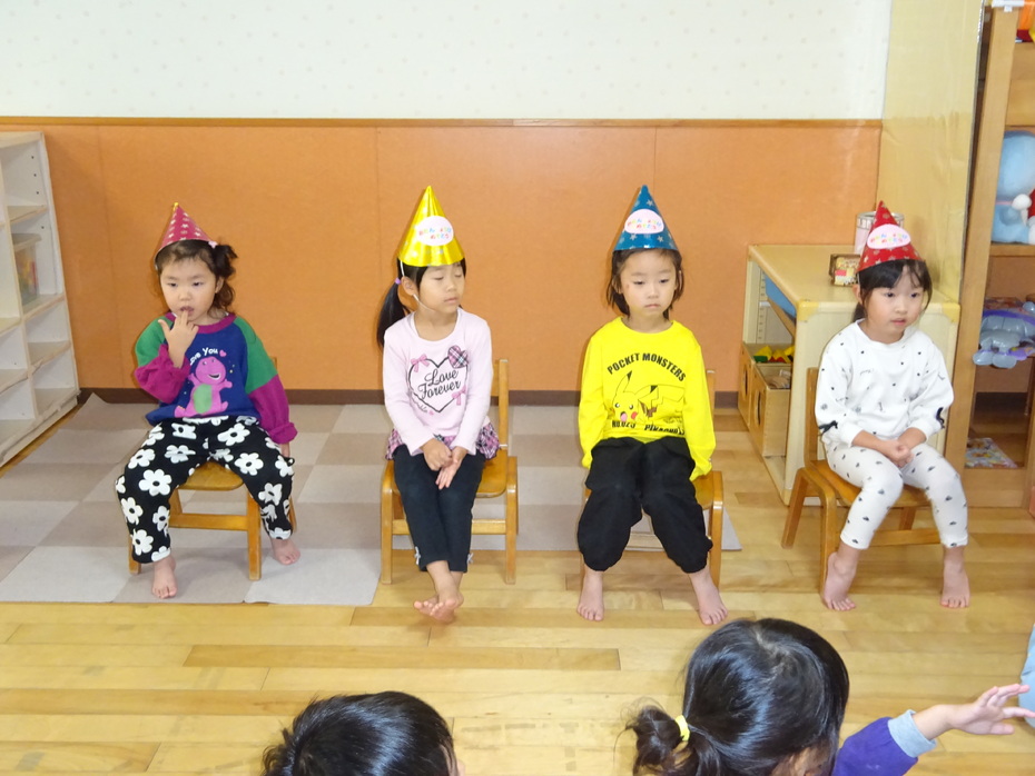 | 今日は11月の誕生会でした。ぱんだ組の保育室で誕生者のお祝いをしました。今月の誕生者は4人です。今日はとってもいい天気で、外で遊びのコーナーを作り、体をたくさん動かして遊びました! | ||