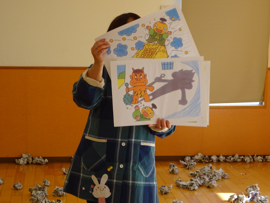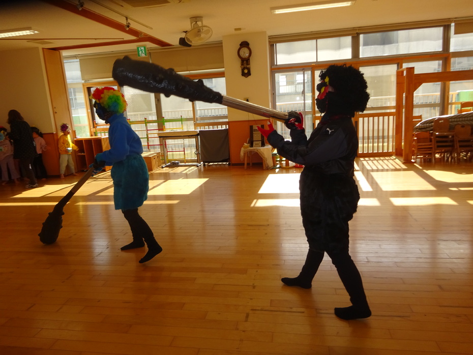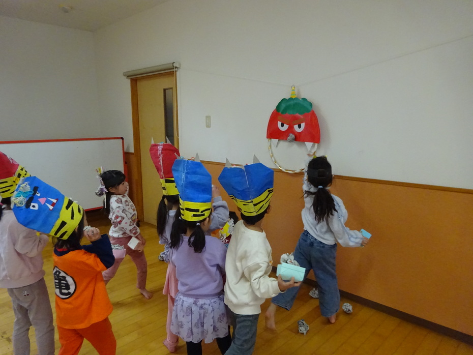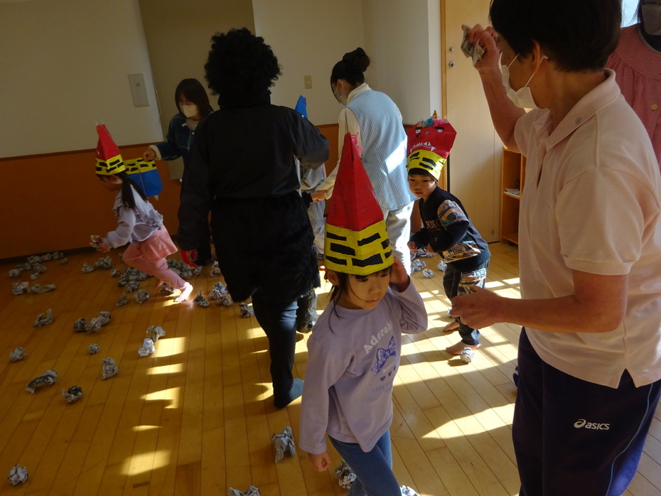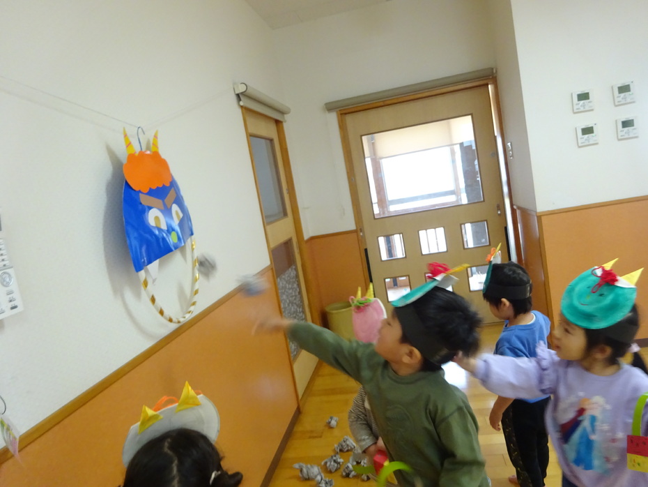 明日が節分ですが、一足早く節分集会をしました。 「鬼来る~?」と朝からドキドキの子ども達…思ったよりも早く鬼がやってきてビックリ!新聞紙の豆を元気に投げて応戦したり、泣いて逃げたり、いろいろな表情の子ども達でした。