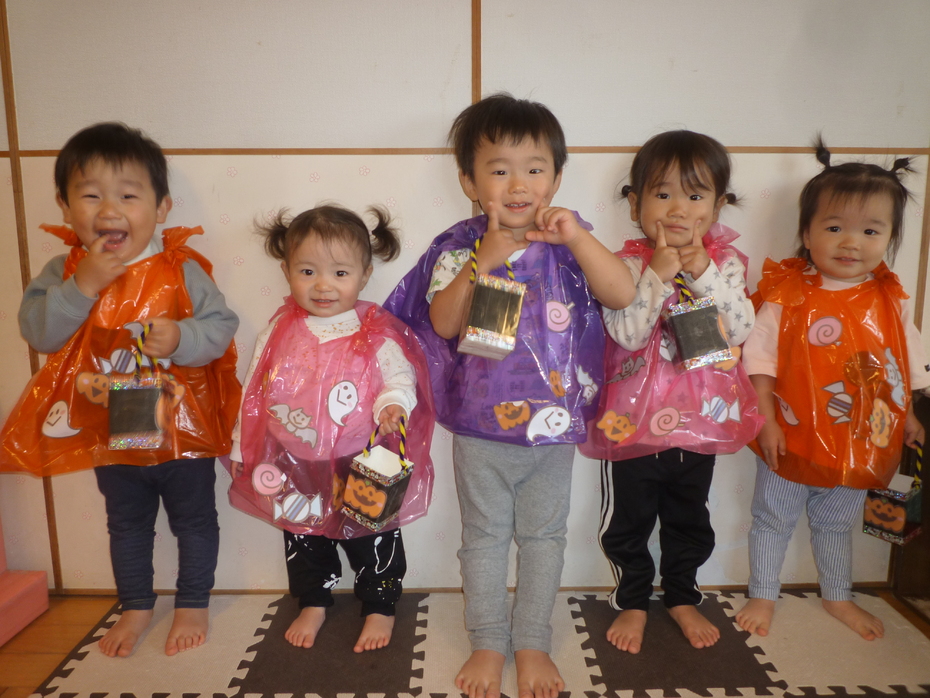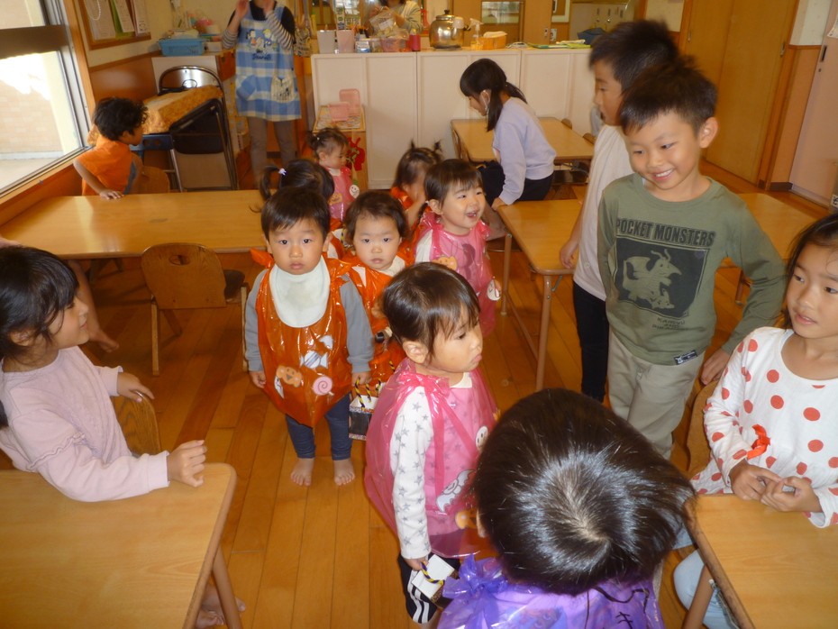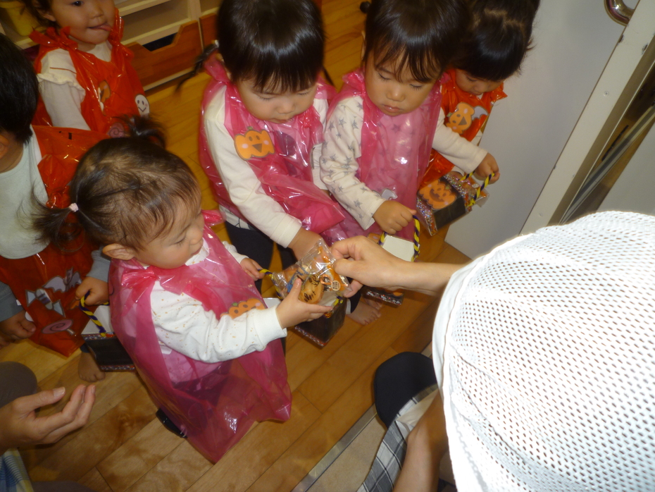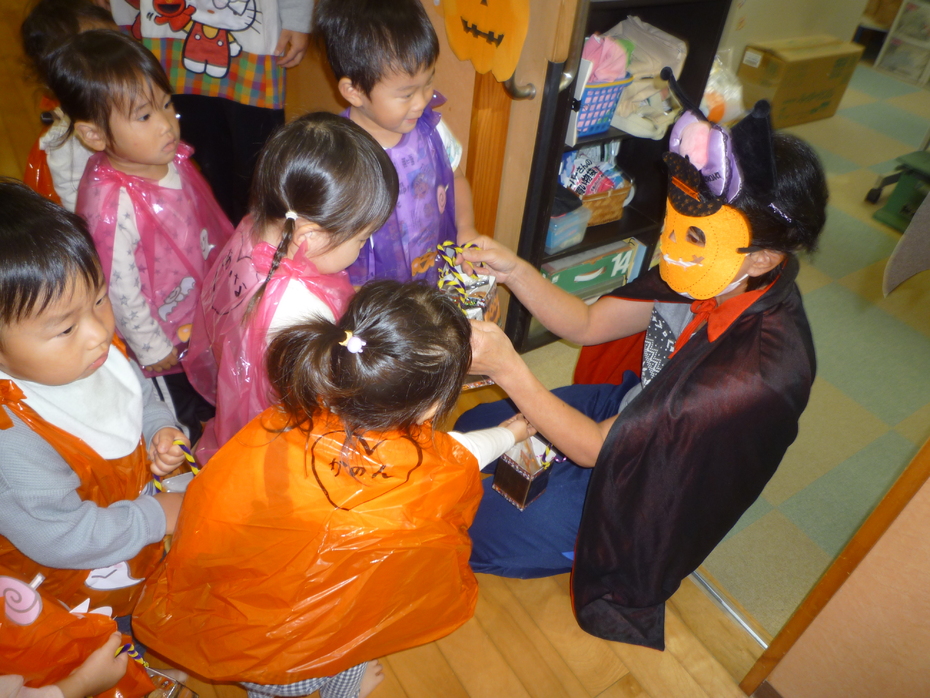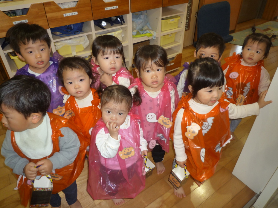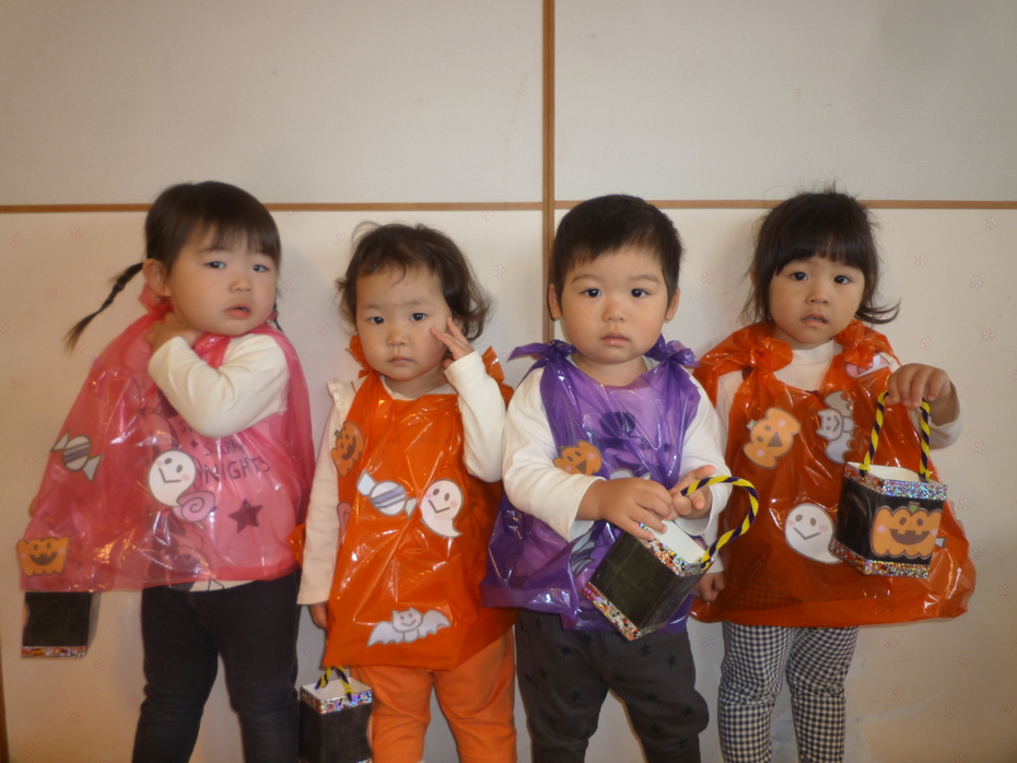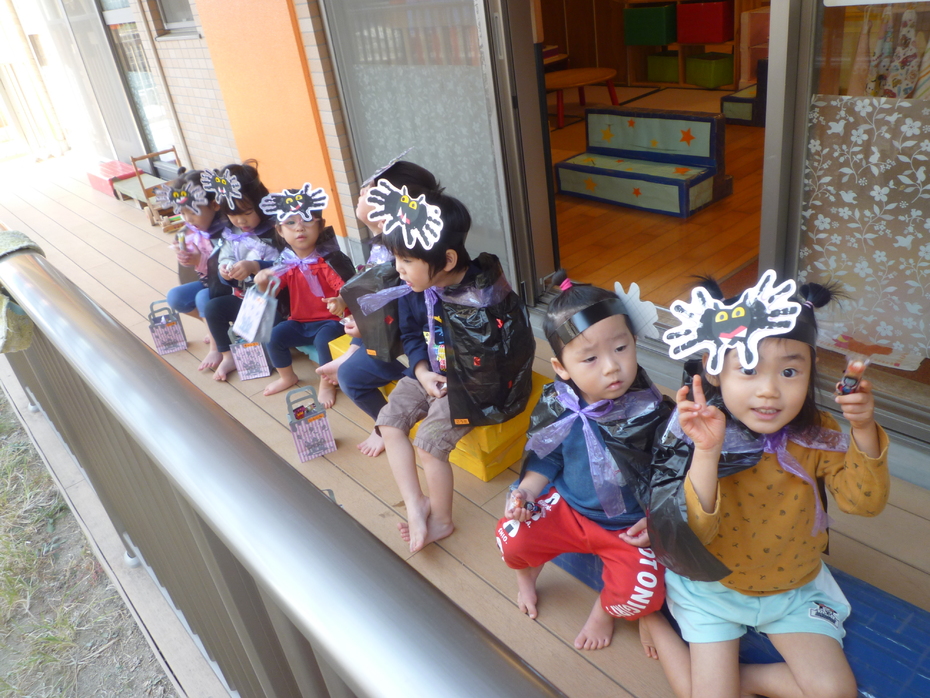 | 今日はハロウィンです♪「お菓子をくれないといたずらしちゃうぞ~」と言いながら園内探検をしました!衣装を着てかわいく変身した子ども達です。そして、お菓子をもらってニコニコでした♪ | ||