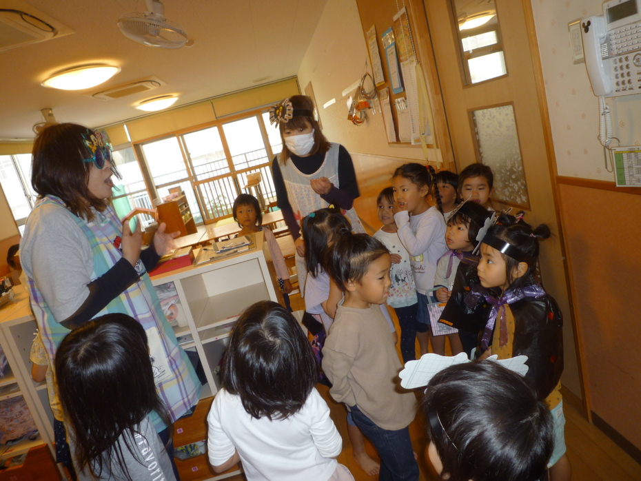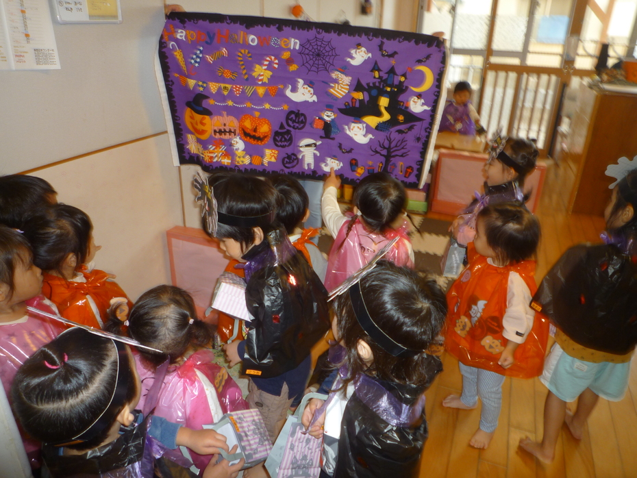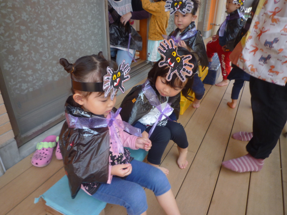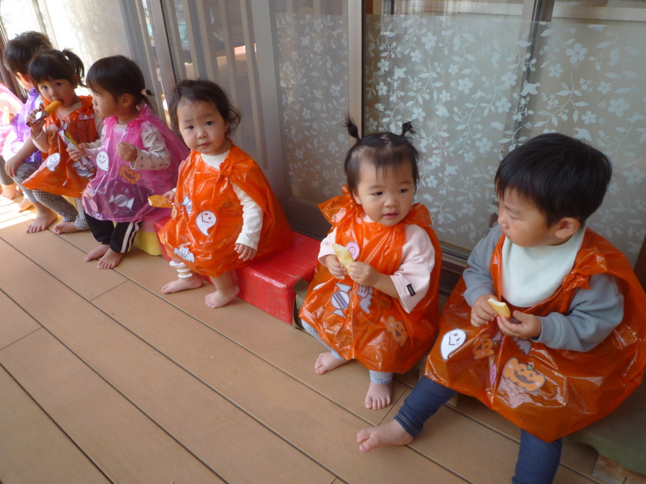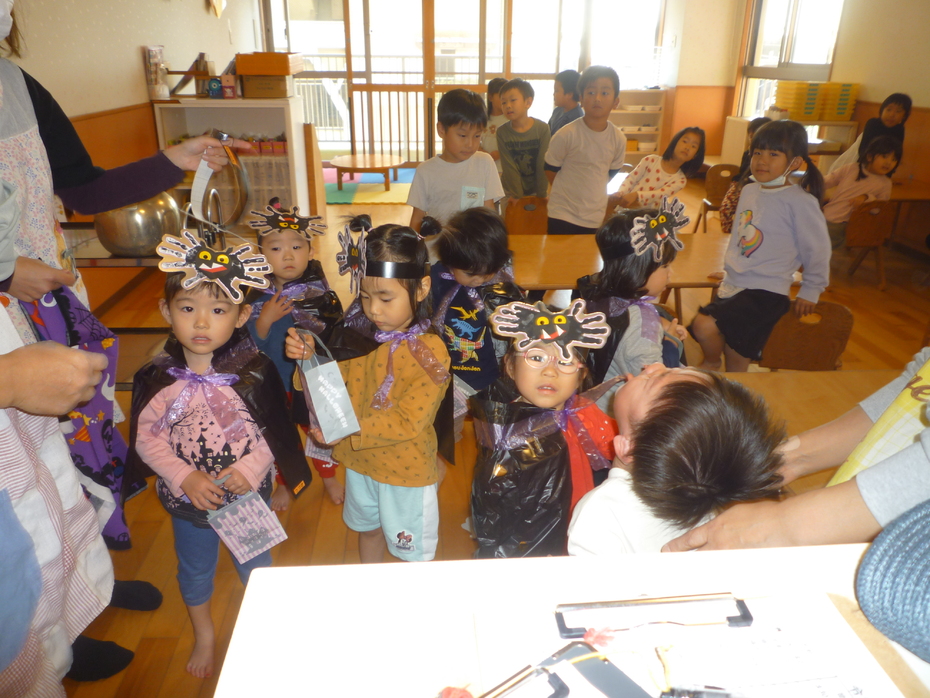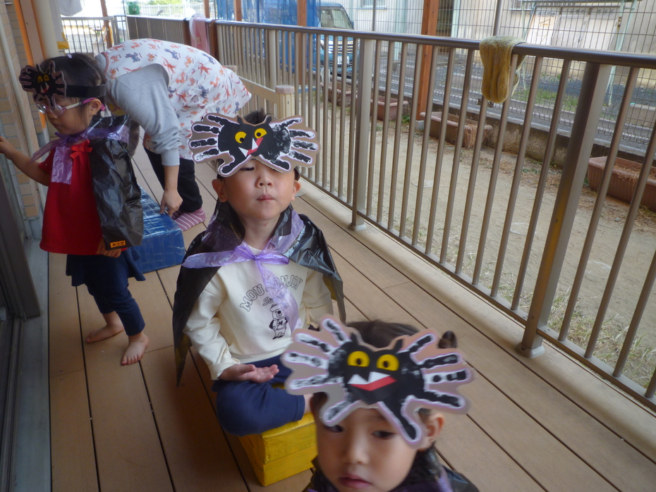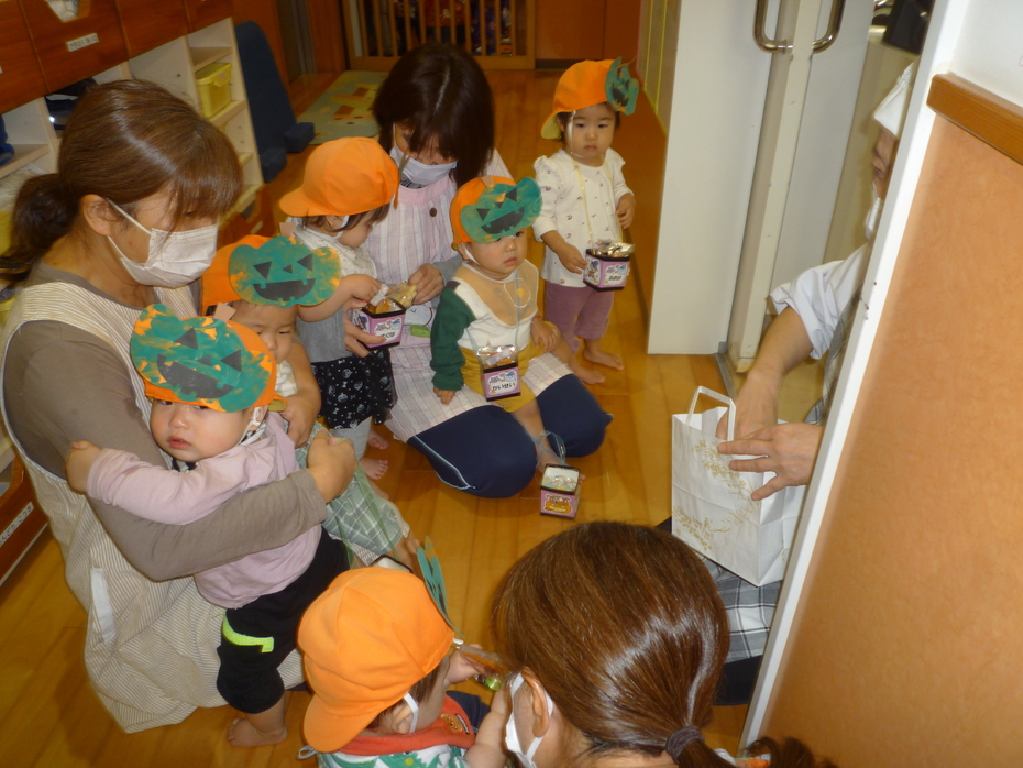 | 今日はハロウィンです♪「お菓子をくれないといたずらしちゃうぞ~」と言いながら園内探検をしました!衣装を着てかわいく変身した子ども達です。そして、お菓子をもらってニコニコでした♪ | ||