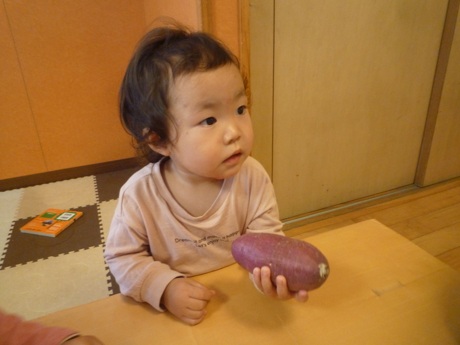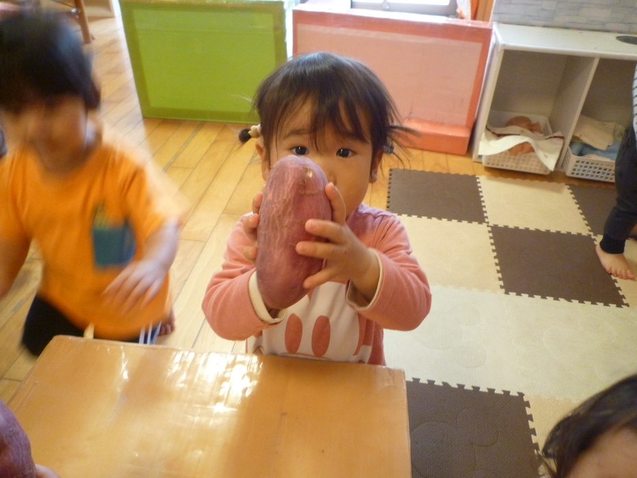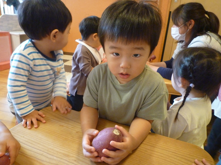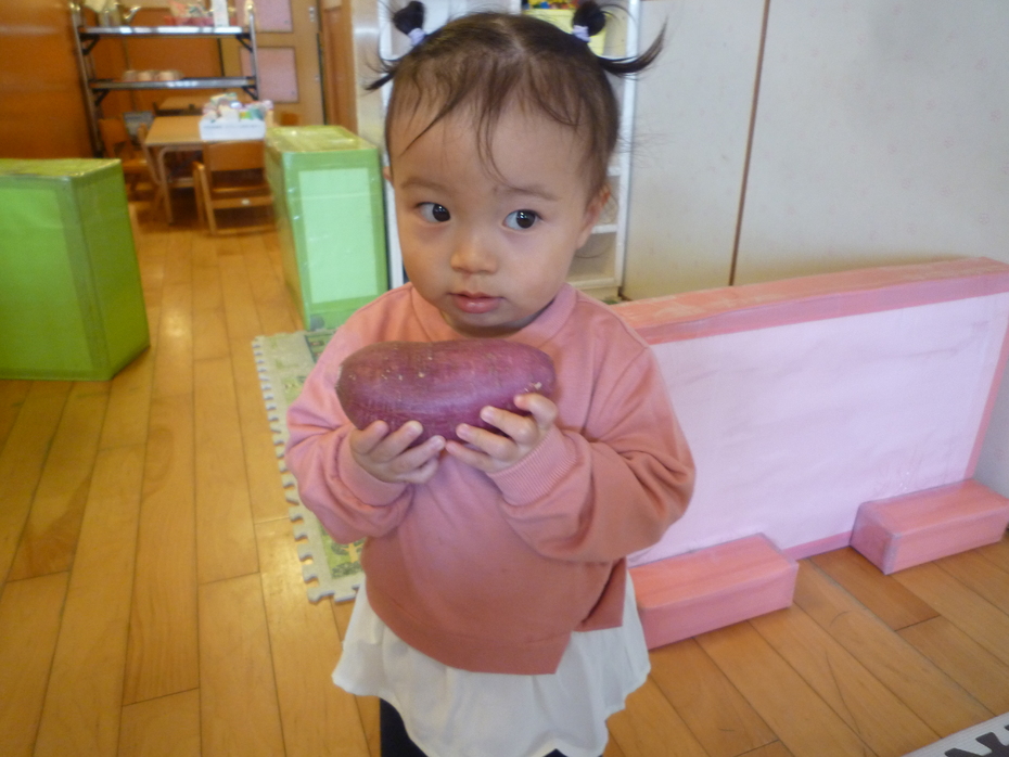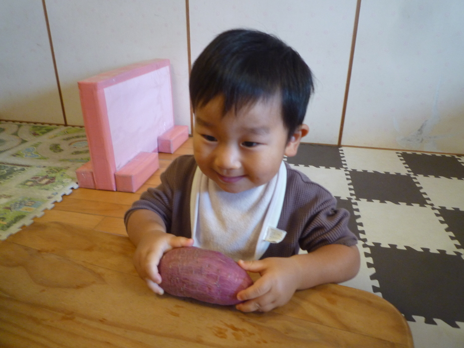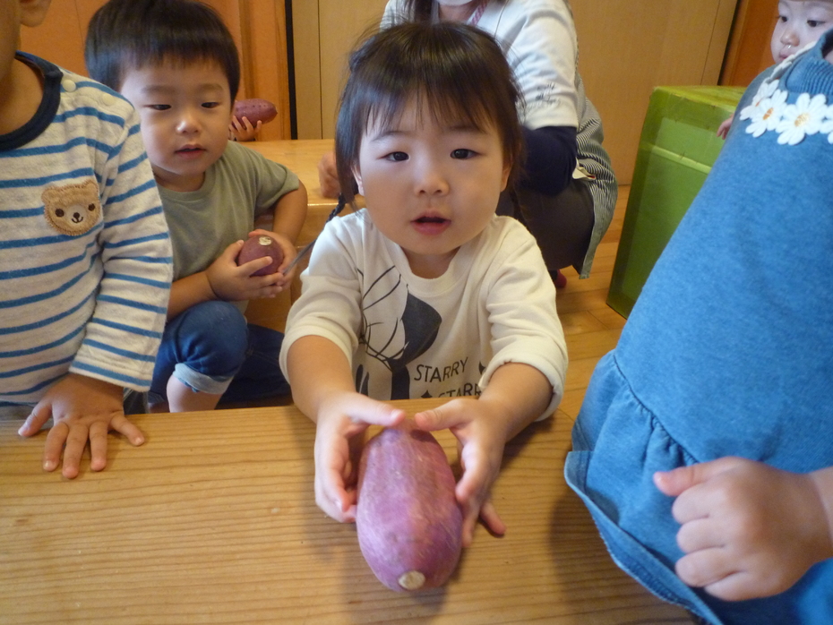 「見て!」とお芋をしっかり持って見せてくれましたよ♪ | ||