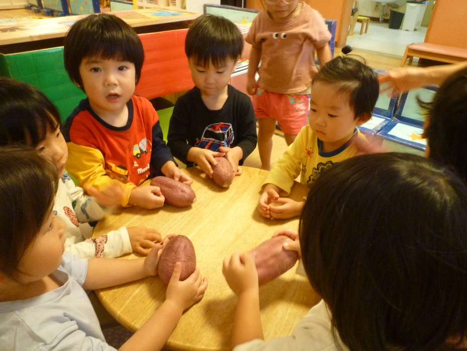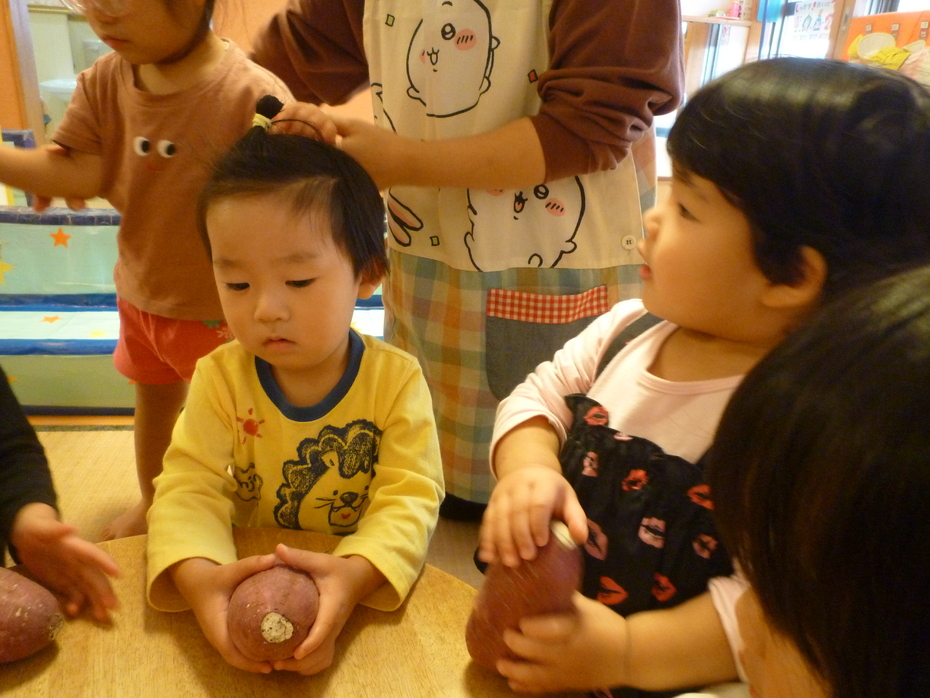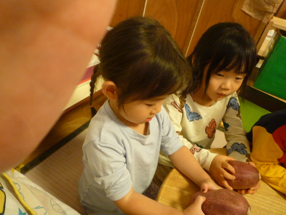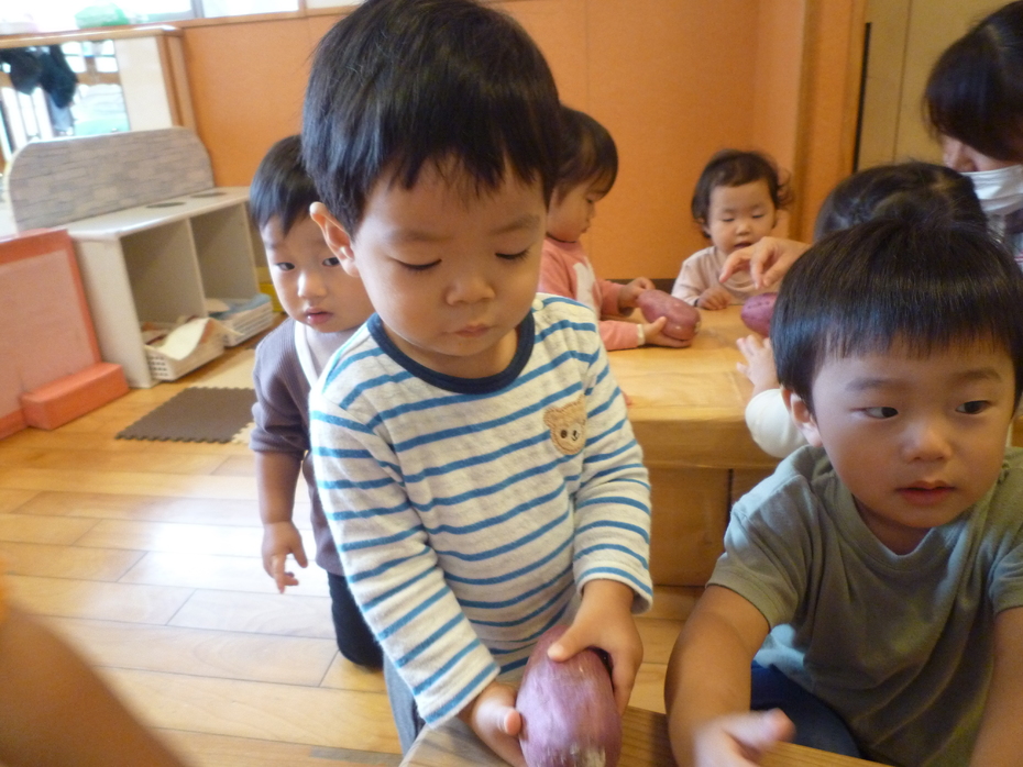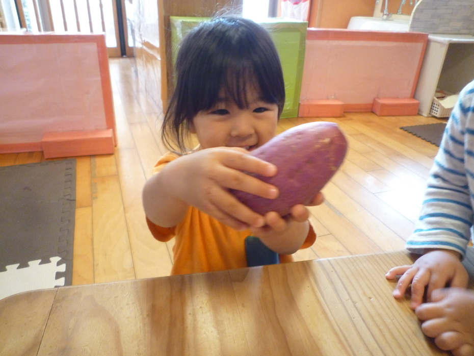 | 今日のおやつは❝ふかしいも❞でした。調理する前のサツマイモを見たり触ったり匂ったり…実物に触れてみました! | ||