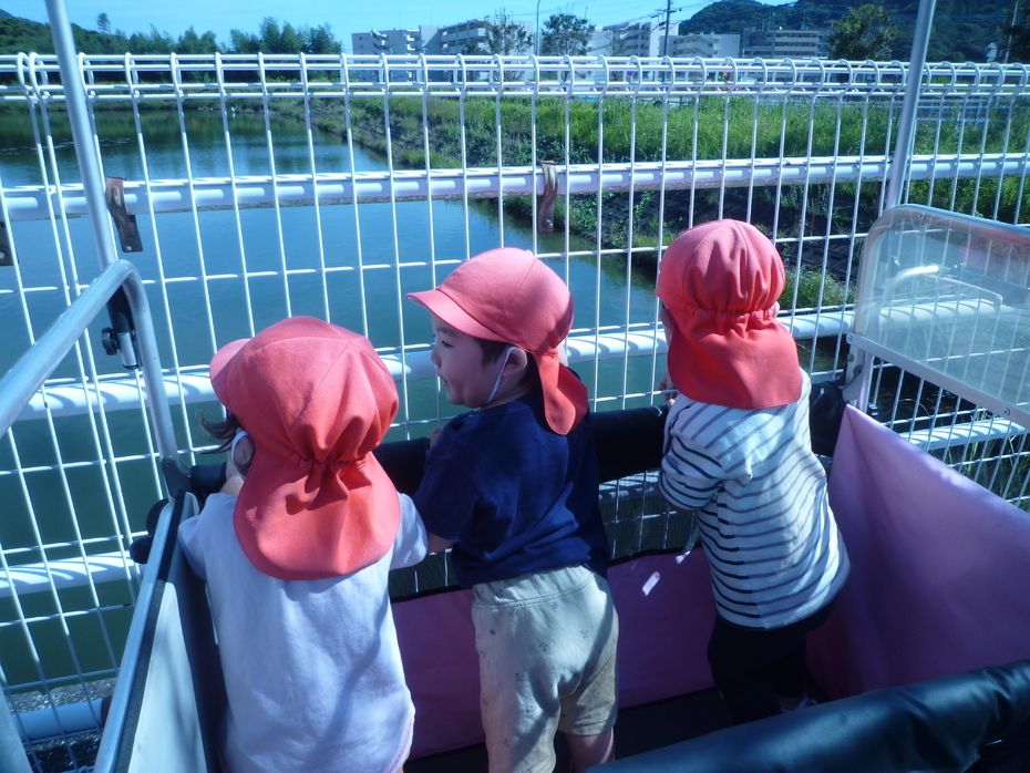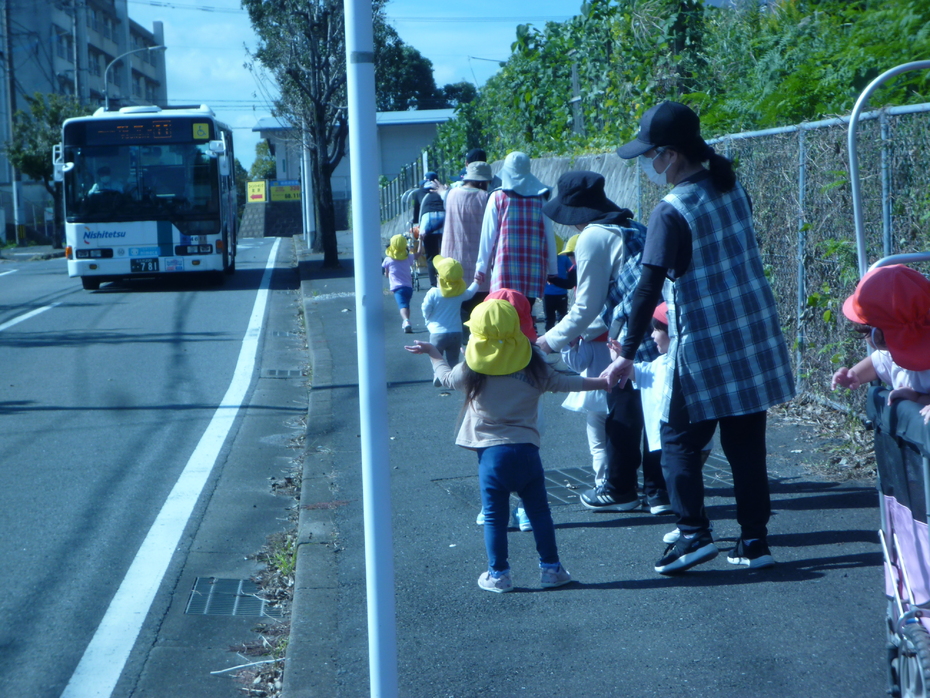 バスとすれ違うたびに「バイバ~イ♪」と手を振る子ども達です!運転手さんも手を振ってくれました♪ | ||