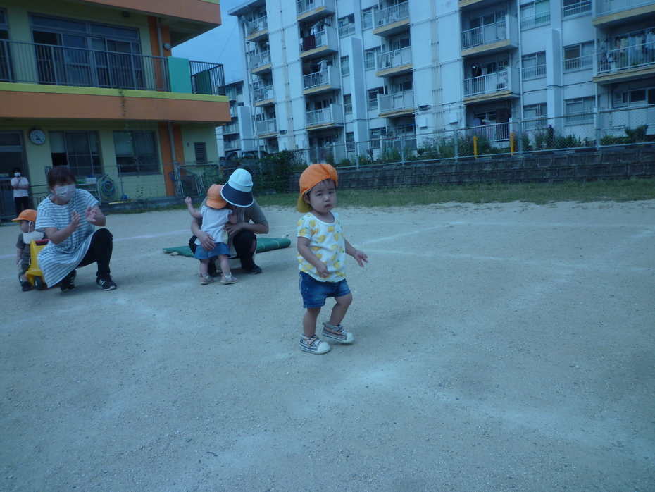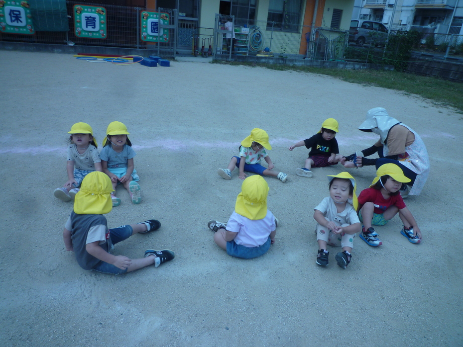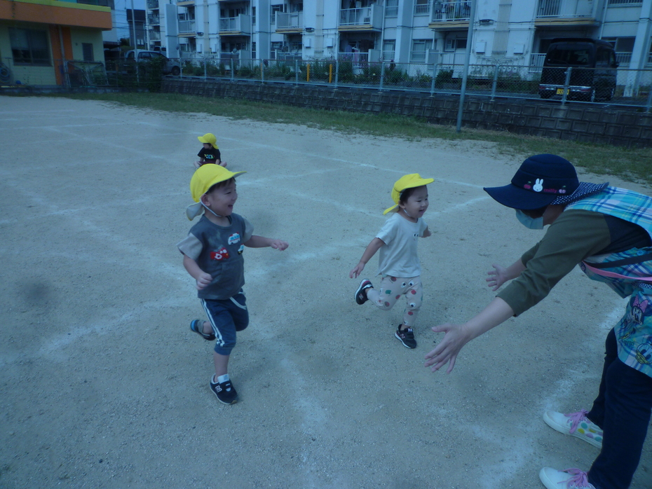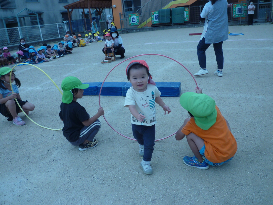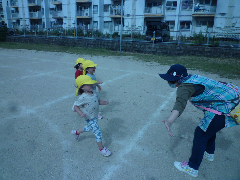 | 戸外で運動会ごっこをしました!大きいクラスのお友達も応援してくれました。たくさんの応援に恥ずかしがる子もいましたが…みんなゴールを目指して頑張りました!! | ||