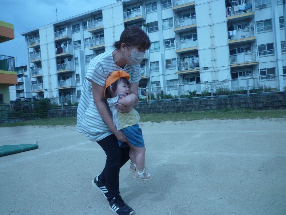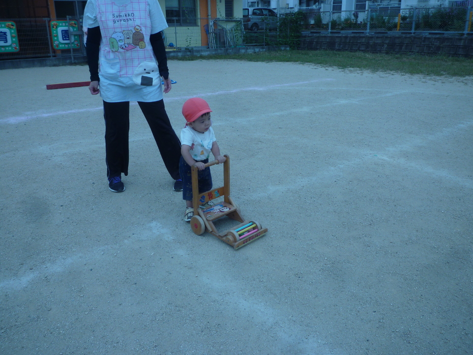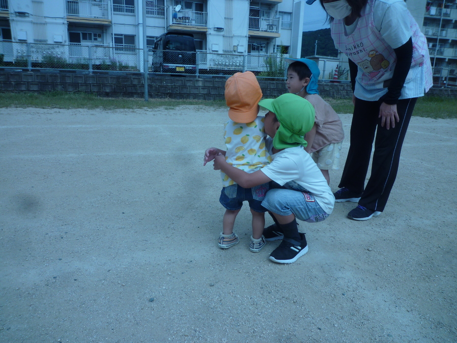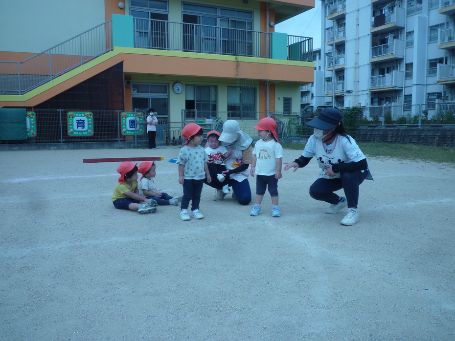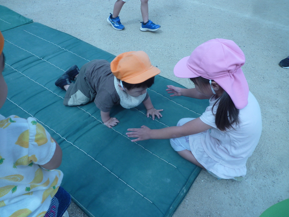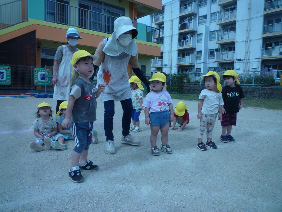 | 戸外で運動会ごっこをしました!大きいクラスのお友達も応援してくれました。たくさんの応援に恥ずかしがる子もいましたが…みんなゴールを目指して頑張りました!! | ||